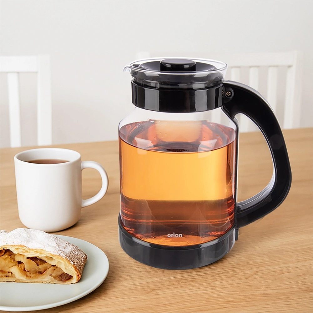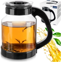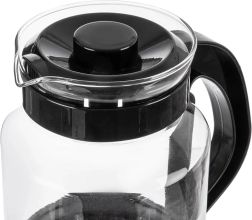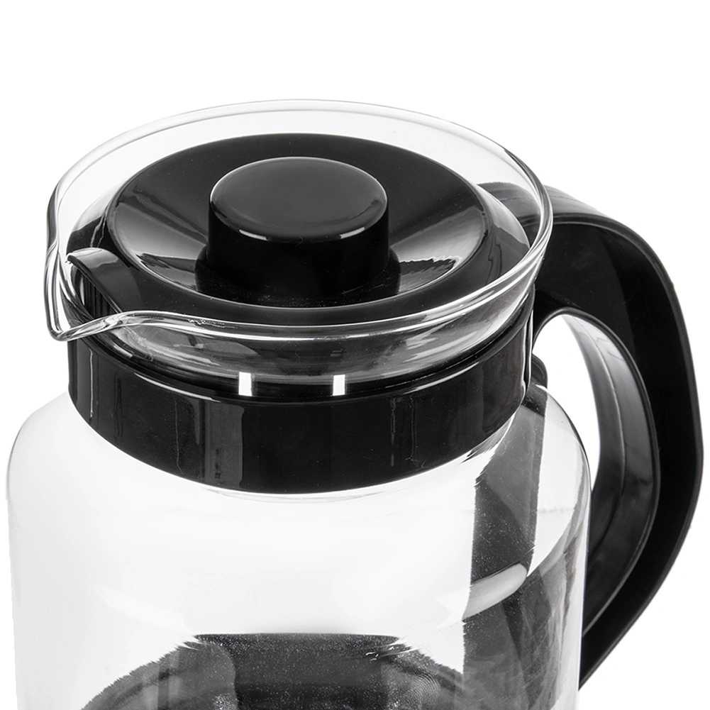 Alsidig glaskande på 2,25 l til nem tilberedning og servering af te, kaffe og kolde drikke. Fremstillet af holdbart borosilikatglas med sort låg og ergonomisk hank for sikker hældning. Høj temperaturbestandighed, praktisk hældetud og låg til at bevare friskheden gør denne kande til et fremragende valg til daglig brug derhjemme og på kontoret.