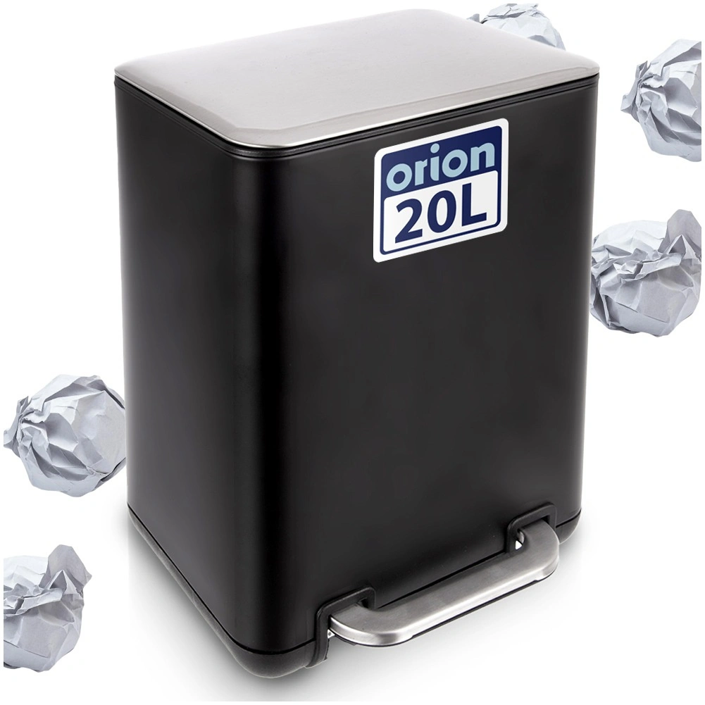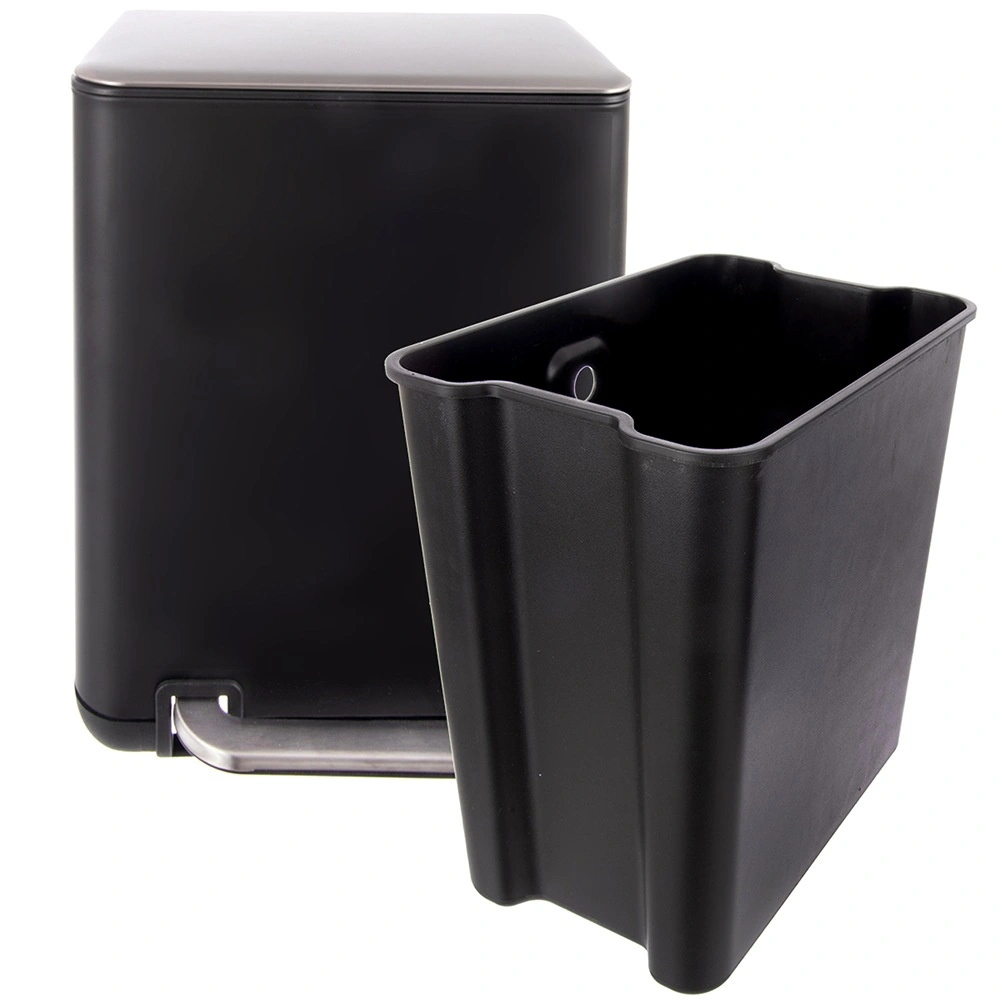 Elegant og praktisk affaldsspand med en kapacitet på 20 l og pedalåbning for hygiejnisk brug uden berøring med hænderne. Robust udførelse i rustfrit stål i mat sort, aftagelig inderbeholder for nem tømning og rengøring. Velegnet til køkken, badeværelse og kontor.