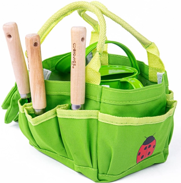 Dette grønne havesæt til børn fra BIGJIGS TOYS fremmer læring gennem leg og kærlighed til naturen. Lærredstasken med mariehøne-motiv holder alt udstyr overskueligt ved hånden, mens de kvalitets trægreb og metalhoveder på værktøjet sikrer sikker og holdbar brug. Ideelt til de første forsøg med såning, omplantning og vanding sammen med forældre.