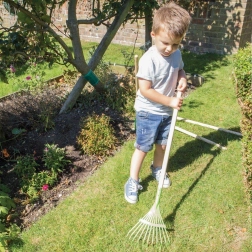 Det ergonomiske træskaft og den velafbalancerede konstruktion gør det behageligt og sikkert for børn at bruge, når de river blade og græs.