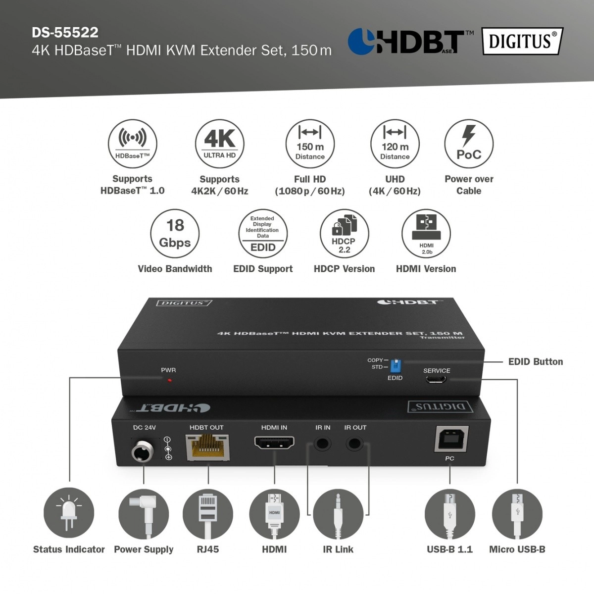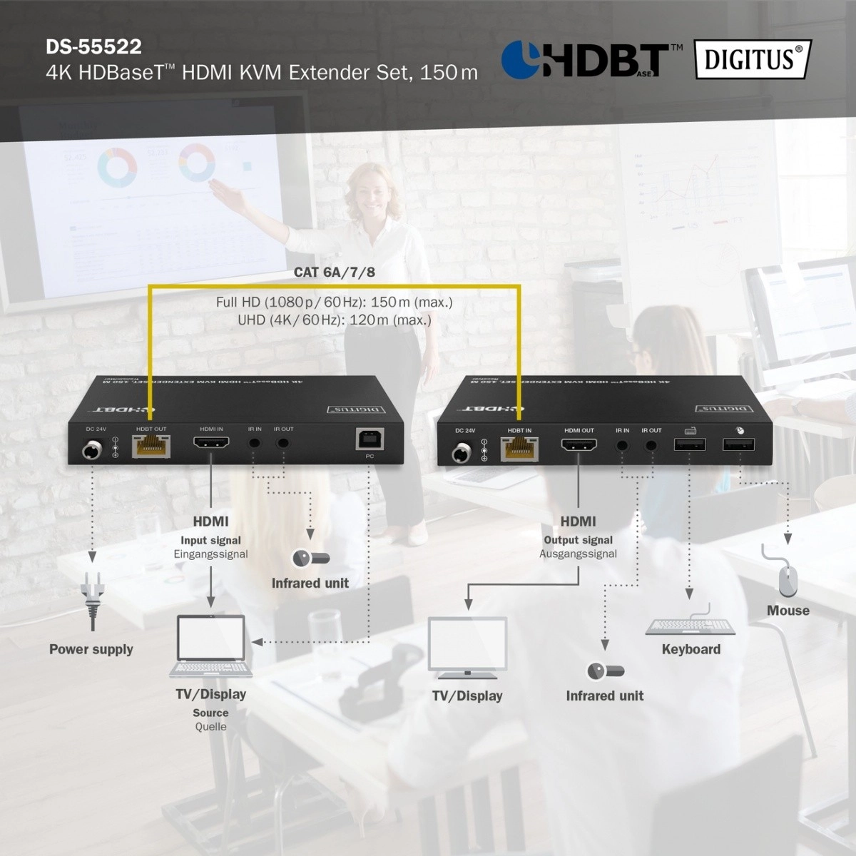 • Lang rækkevidde: op til 150 m for 1080p/60, op til 120 m for 4K/60 via CAT6A/7/8