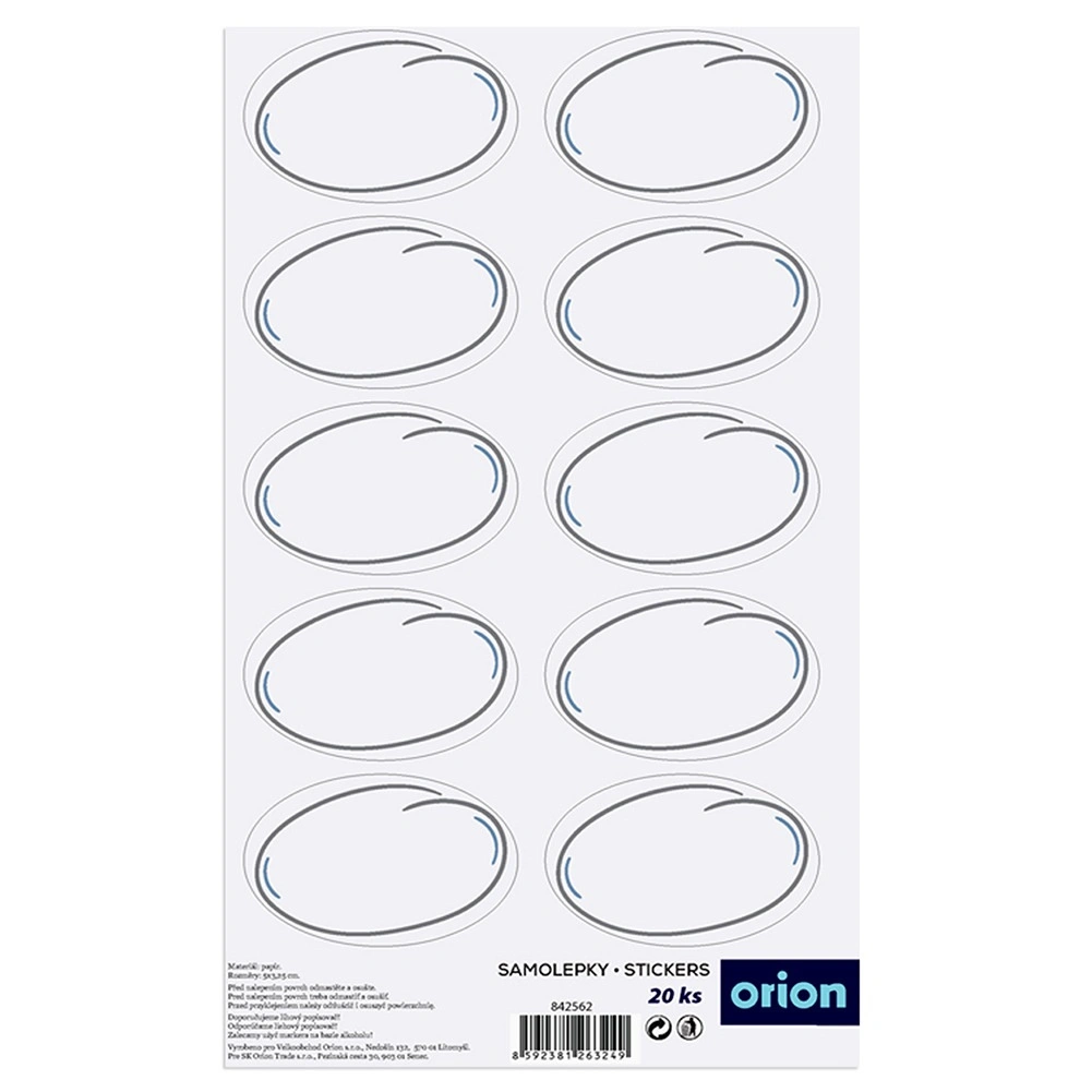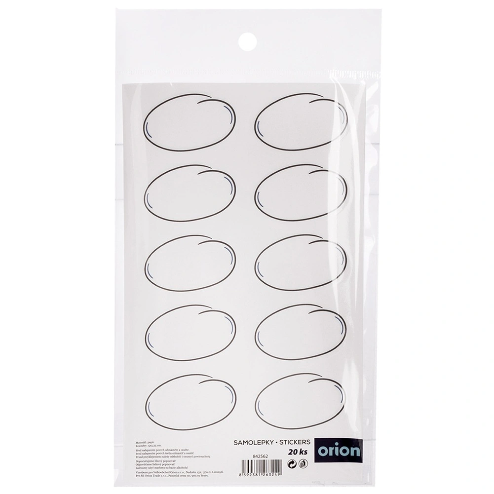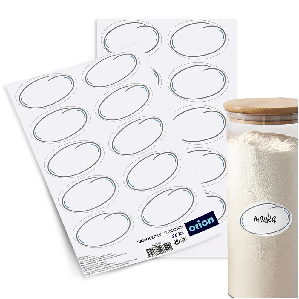 Praktisk sæt med 20 selvklæbende etiketter i størrelsen 5 × 3 cm til tydelig mærkning af glas, flasker og beholdere. De hvide, laminerede etiketter har et rent og læsbart udseende, klæber let uden behov for ekstra lim og hjælper med organisering af køkken og spisekammer. Originalt produkt fra mærket ORION fremstillet efter europæiske standarder.