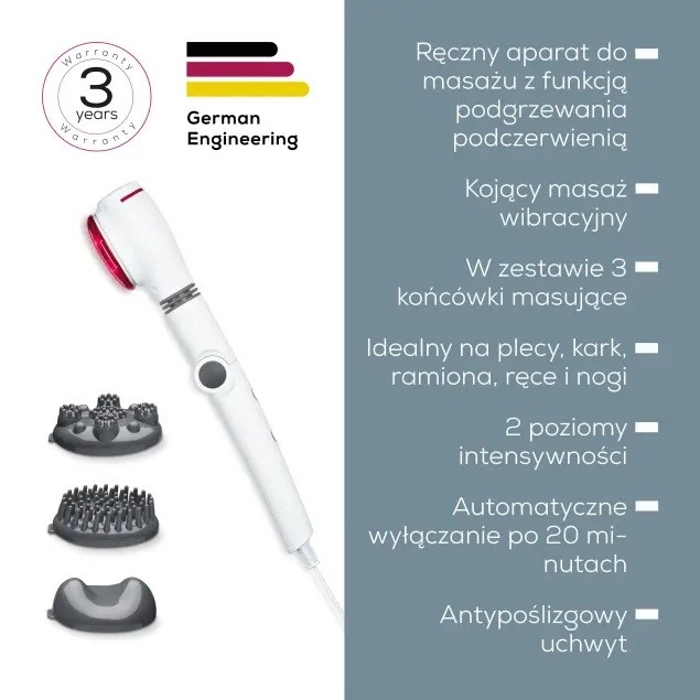 Nyd dyb afslapning med massageapparatet MG44, som kombinerer vibrationsmassage og valgfri infrarød varme. Takket være den roterende massagehoved 180°, det justerbare håndtag og 3 udskiftelige tilbehør kan du nemt løsne spændte muskler på ryg, nakke, skuldre, arme og ben.