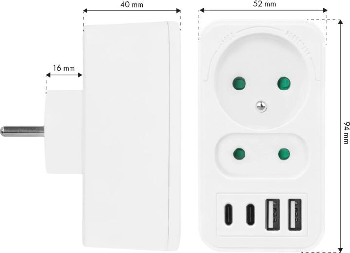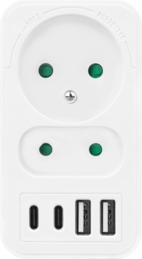 Praktisk stikdåseadapter kombinerer to AC-udtag og fire USB-porte til samtidig strømforsyning af flere enheder. Den tilbyder 2× USB‑A op til 18 W og 2× USB‑C med Power Delivery op til 20 W for hurtig og sikker opladning af telefoner, tablets og tilbehør. Ideel til både hjem og kontor takket være kompakt design og universelle tilslutningsmuligheder.