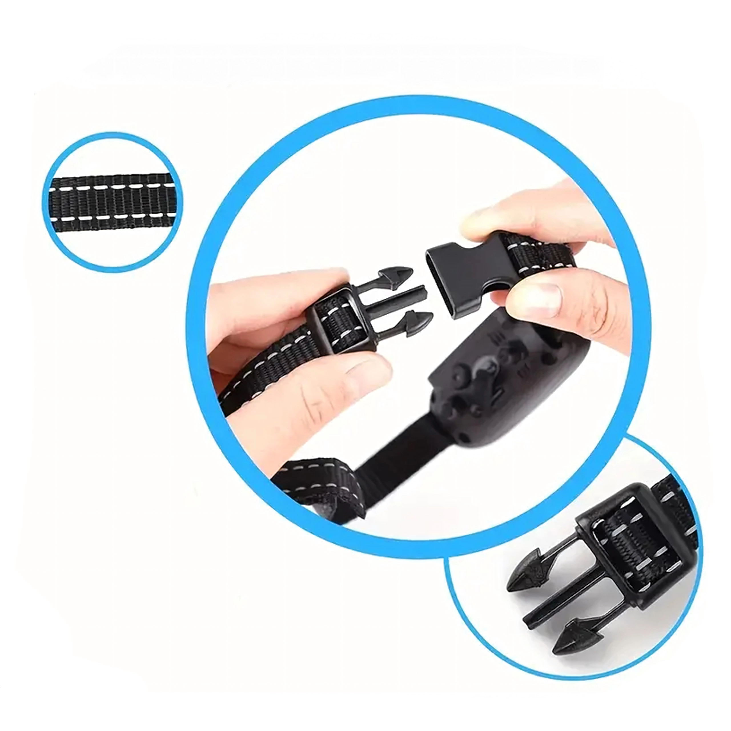 Den holdbare nylonrem med reflekterende syninger justeres nemt til både små og store hunde. Halsbåndet er vandtæt, så det klarer regn og udendørs leg på græsset. USB-opladning sikrer praktisk brug uden batteriskift.