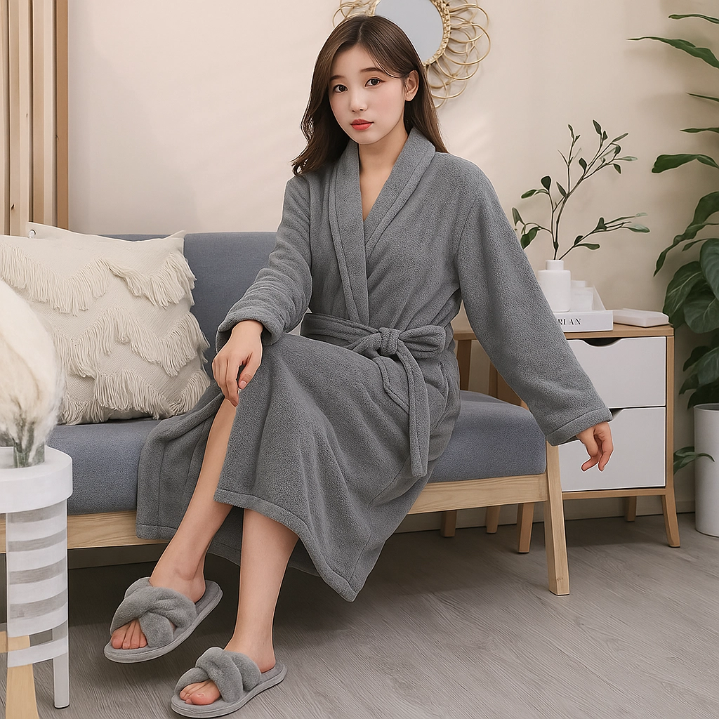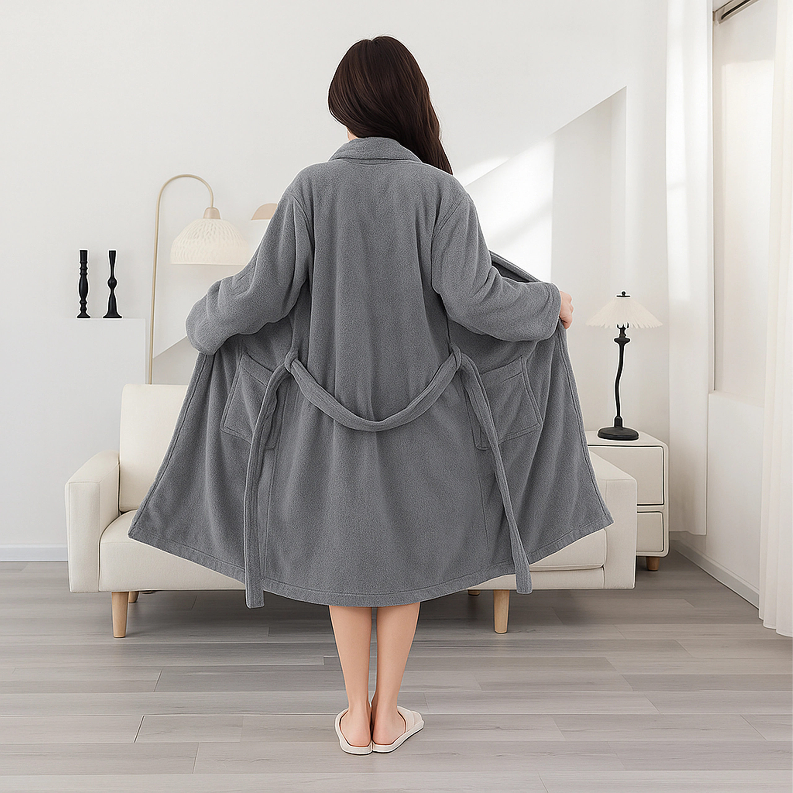 Det plyssete materiale giver øjeblikkelig varme og fløjlsblød komfort efter badet og ved afslapning.
