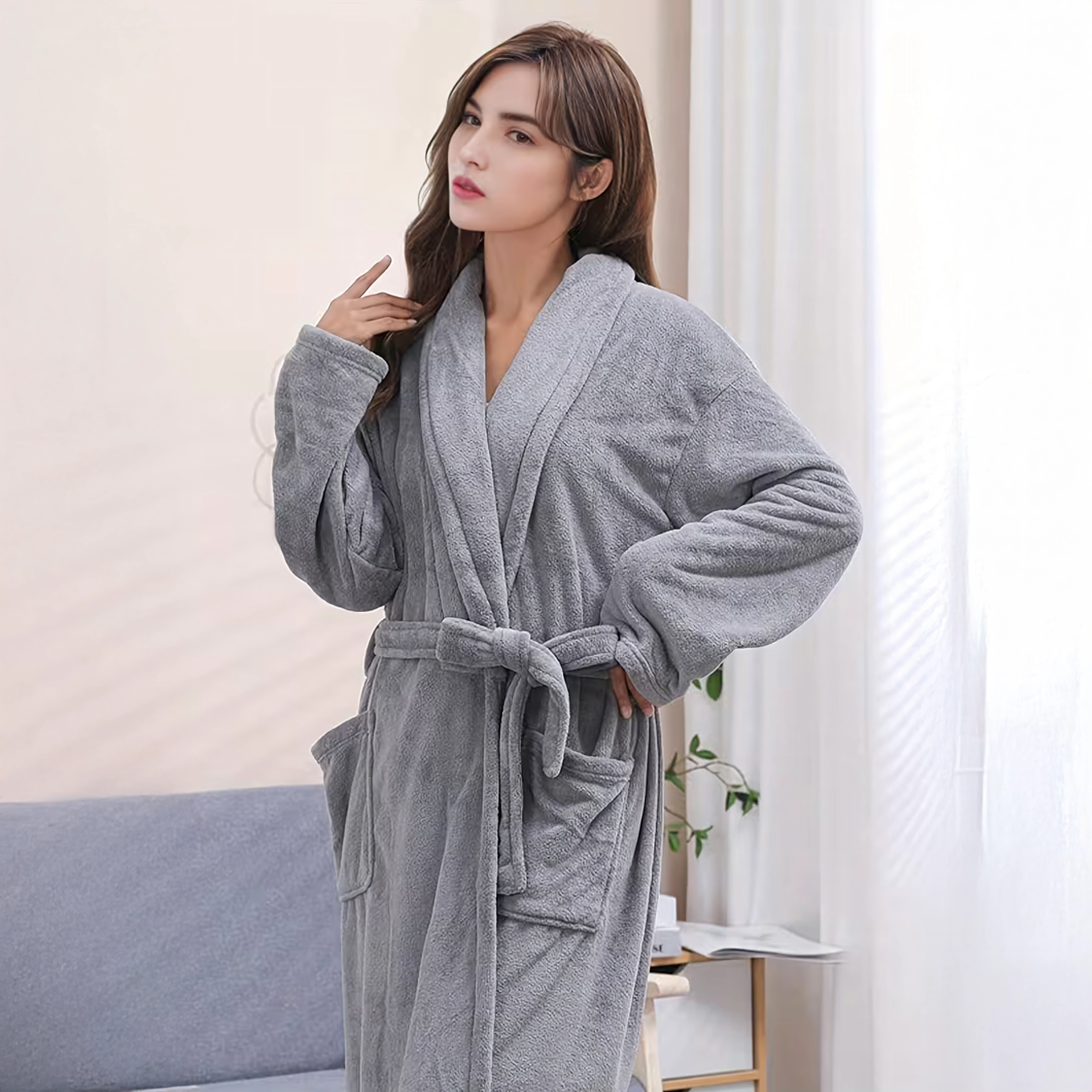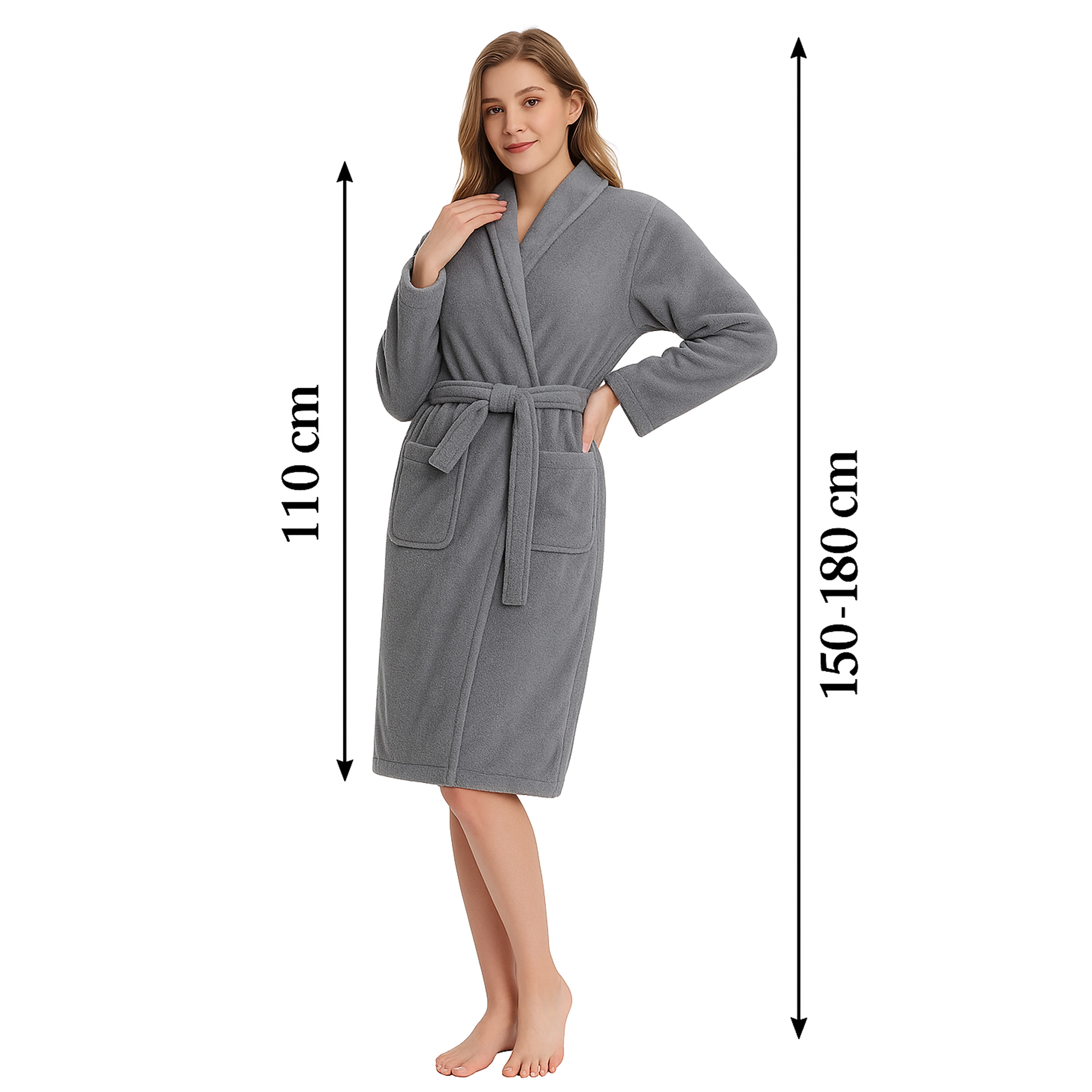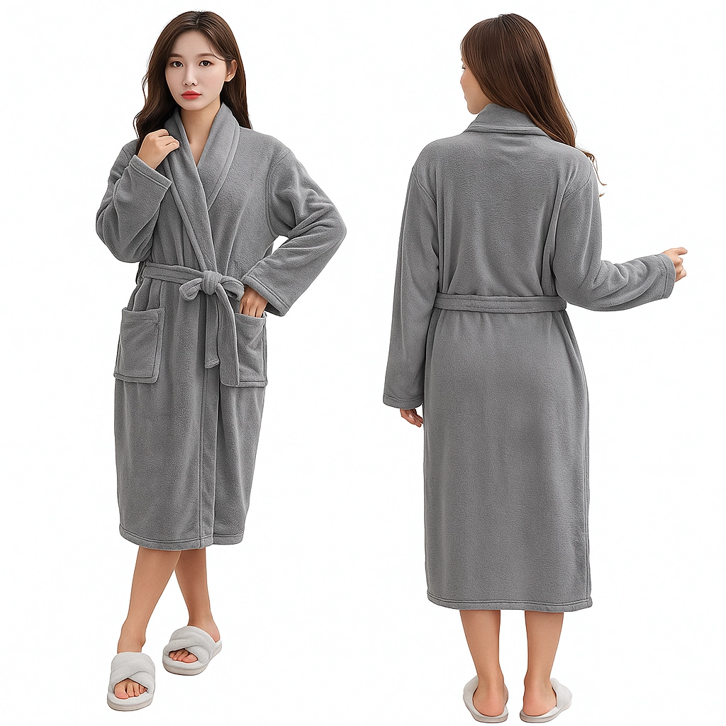 Denne damebadekåbe i elegant grå er ideel til stunder med afslapning derhjemme og efter brusebadet. Det bløde, plyssete mikrofiber varmer behageligt, mens sjalskraven og bæltet i taljen fremhæver den komfortable pasform og gør det let at tilpasse størrelsen.
