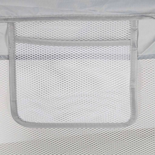 Den praktiske børnegård i målene 120 × 120 cm skaber et sikkert og rummeligt sted til leg og hvile. Takket være netvægge har du altid babyen inden for synsvidde, lynlåsdøren giver nem adgang, og let montering uden skruer sparer tid. Stabiliteten sikres af samlinger med sugekopper, og bløde tekstile kanter øger sikkerheden og komforten.