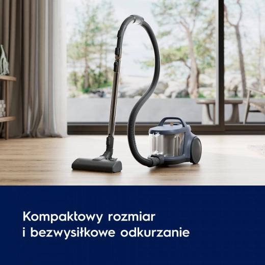 Det kompakte kabinet, store hjul og 9 m rækkevidde gør den let at manøvrere og opbevare. HEPA-filtersystemet opfanger op til 99,95 % af partikler ned til 0,3 µm, så luften i hjemmet bliver renere.