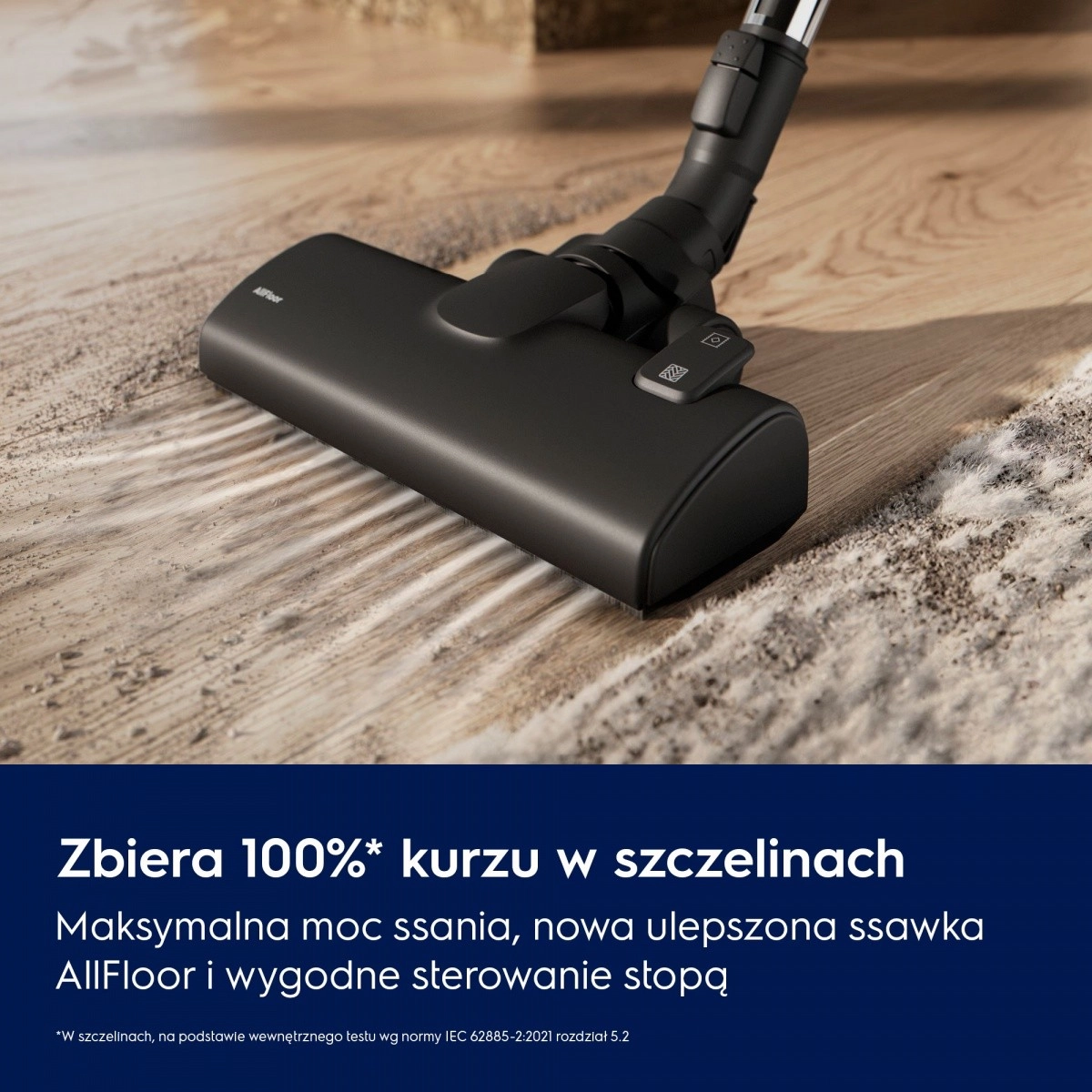 Støvsugeren opnår høj effektivitet ved opsamling af støv i sprækker, og med det nye AllFloor-mundstykke klarer den både hårde gulve og tæpper. Skift af børste klares nemt med foden.