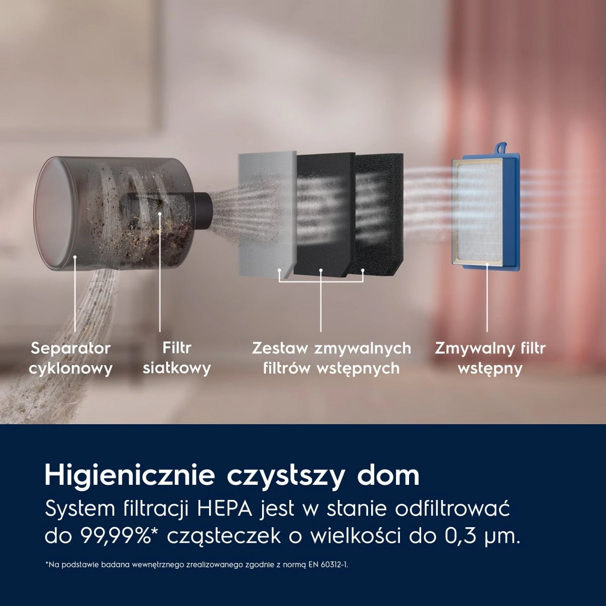 - HEPA, opfanger op til 99,99 % af partikler på 0,3 μm (i henhold til EN 60312-1)