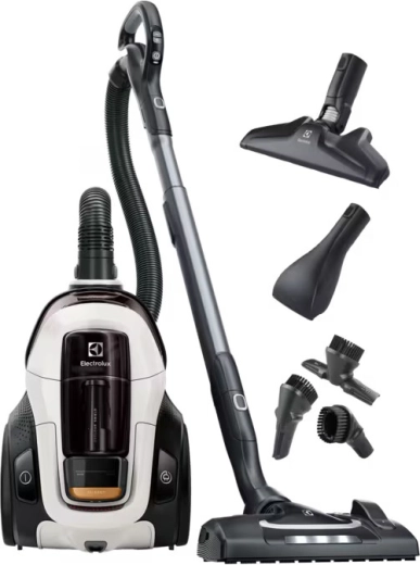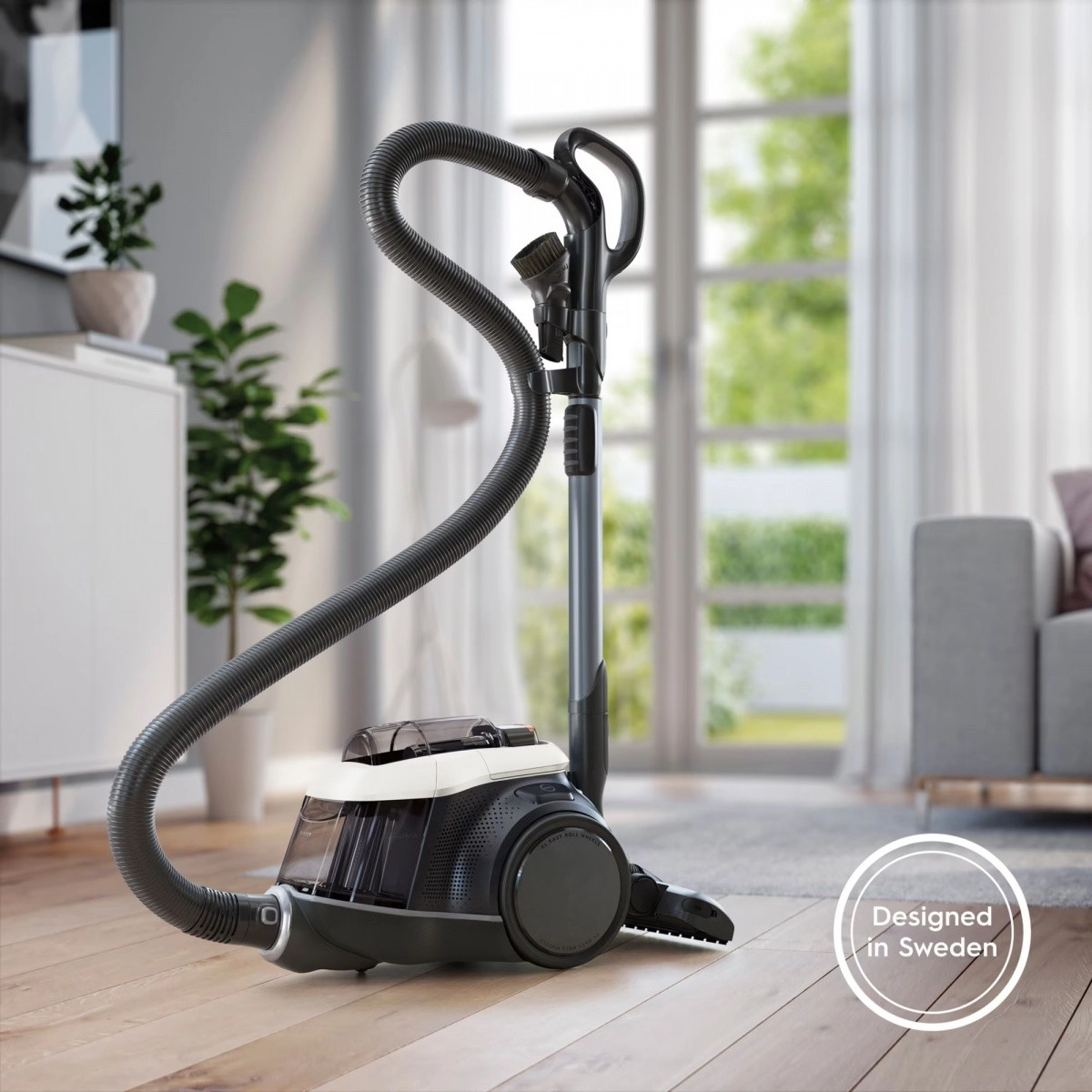 HEPA-filtreringen opfanger op til 99,999 % fine partikler (finstøv, husstøvmider og allergener) ned til 0,3 µm, hvilket bidrager til renere indeluft. Den intuitive konstruktion muliggør hurtig tømning af beholderen og nem adgang til filtrene. Store, letroterende hjul giver smidig manøvredygtighed omkring møbler og forhindringer.