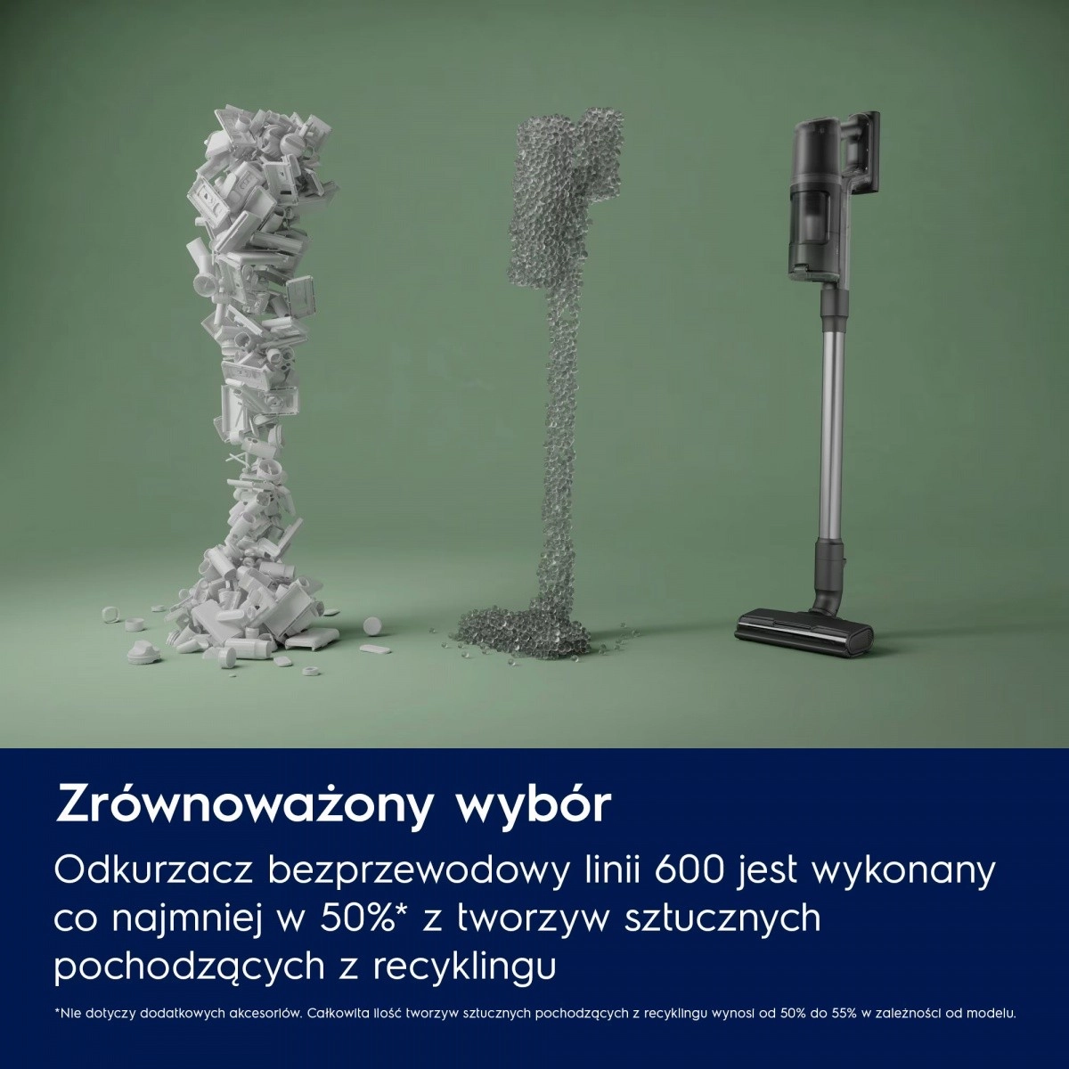 Den trådløse konstruktion med et kvalitetsbatteri med 6 celler giver op til 50 minutters drift i håndholdt tilstand. Hurtig frigivelse af håndtaget og skift af tilbehør sikrer en glidende overgang mellem gulve, hjørner og polstring. Den hygiejniske tømning af beholderen på 0,5 l med én knap minimerer kontakt med støv og holder hjemmet rent.