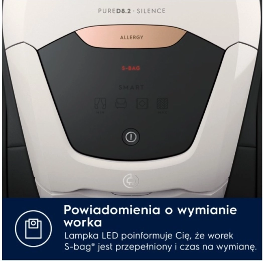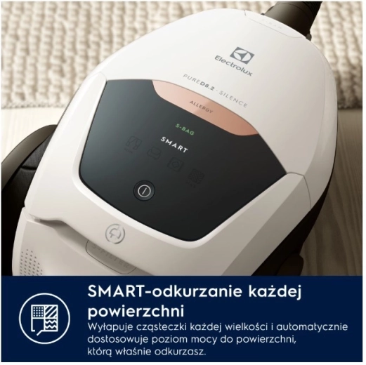 PURE D8.2 SILENCE hører til blandt de mest stille traditionelle støvsugere med pose – med det innovative PureSound-system opnår den et lydniveau på kun 57 dB(A). Takket være den automatiske SmartMode-regulering genkender den selv overfladetypen og tilpasser effekten, så du kan skifte problemfrit fra hårdt gulv til tæppe uden manuel indstilling.