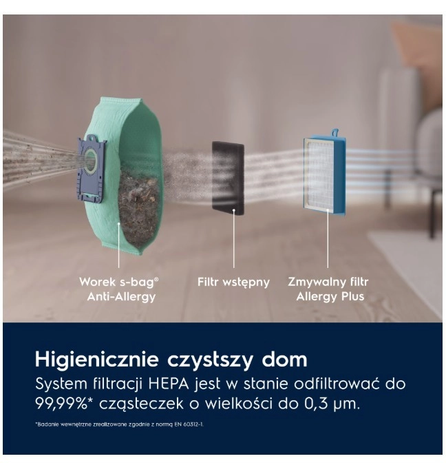 Det nyudviklede mundstykke OneGo Power Clean opsamler effektivt både fint og grovere snavs på forskellige overflader. Det højkvalitets vaskbare HEPA-filter opfanger op til 99,99 % af partikler ned til 0,3 μm – støv, støvmider og allergener – for et hygiejnisk rent hjem og friskere luft.