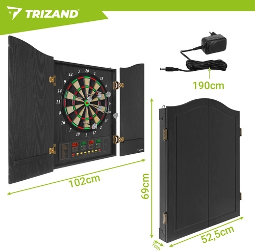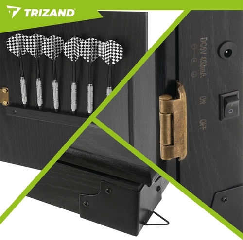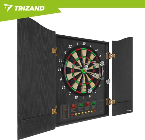 Den elektroniske dartskive TRIZAND bringer moderne underholdning hjem til familie og venner. Takket være automatisk scoringsenhed, lydstyrkeregulering og overskuelige LED-skærme har du altid styr på resultaterne. Det elegante skab med døre beskytter skiven mod støv og passer perfekt i stue, spillerum eller på kontoret.