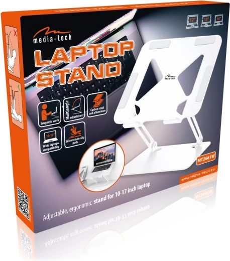Universelt laptopstativ i elegant hvid farve, som forbedrer ergonomi og luftcirkulation. Takket være den robuste metalkonstruktion, glidende højde- og vinkeljustering op til ca. 17 cm og skridsikre silikonepuder får du stabil støtte til laptops 10–17" og tablets. Det sammenklappelige design gør det nemt at transportere og opbevare.