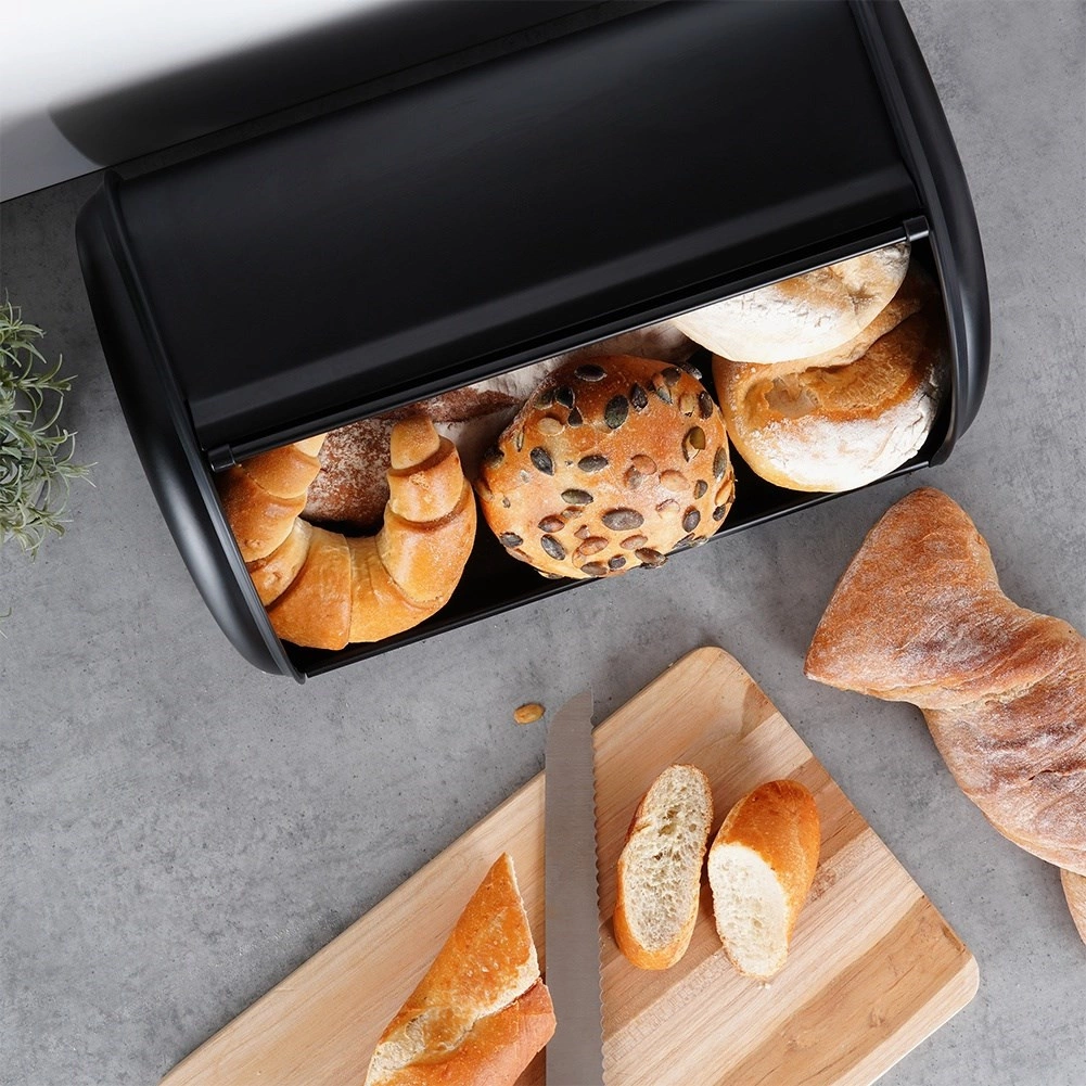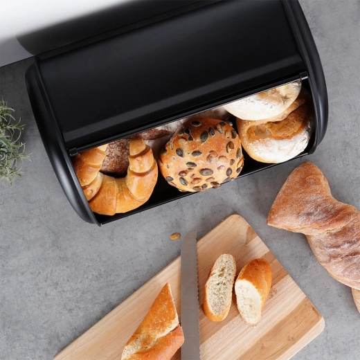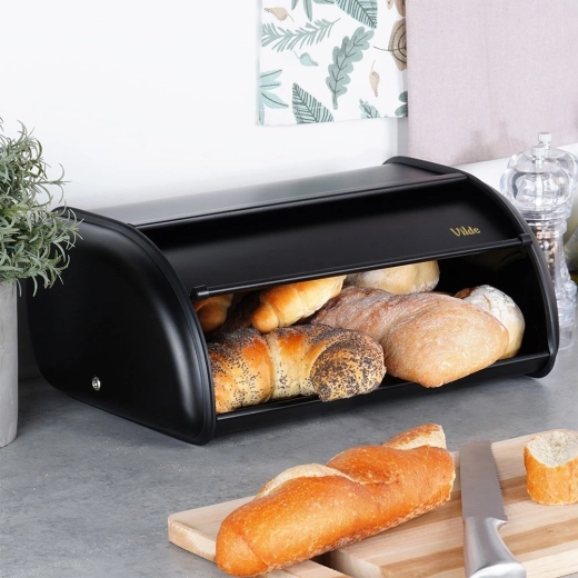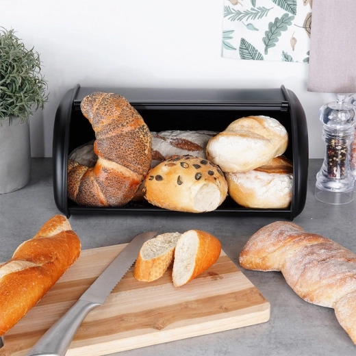Nem daglig brug sikres af den glatte åbning med rullefront, som sparer plads på bordpladen. Metalkroppen er stabil og modstandsdygtig over for skader, så bagværket forbliver sikkert. Brødkassen er også en praktisk løsning til organisering af køkkenbordet – den reducerer rod og beskytter bagværket mod lufttilførsel.
