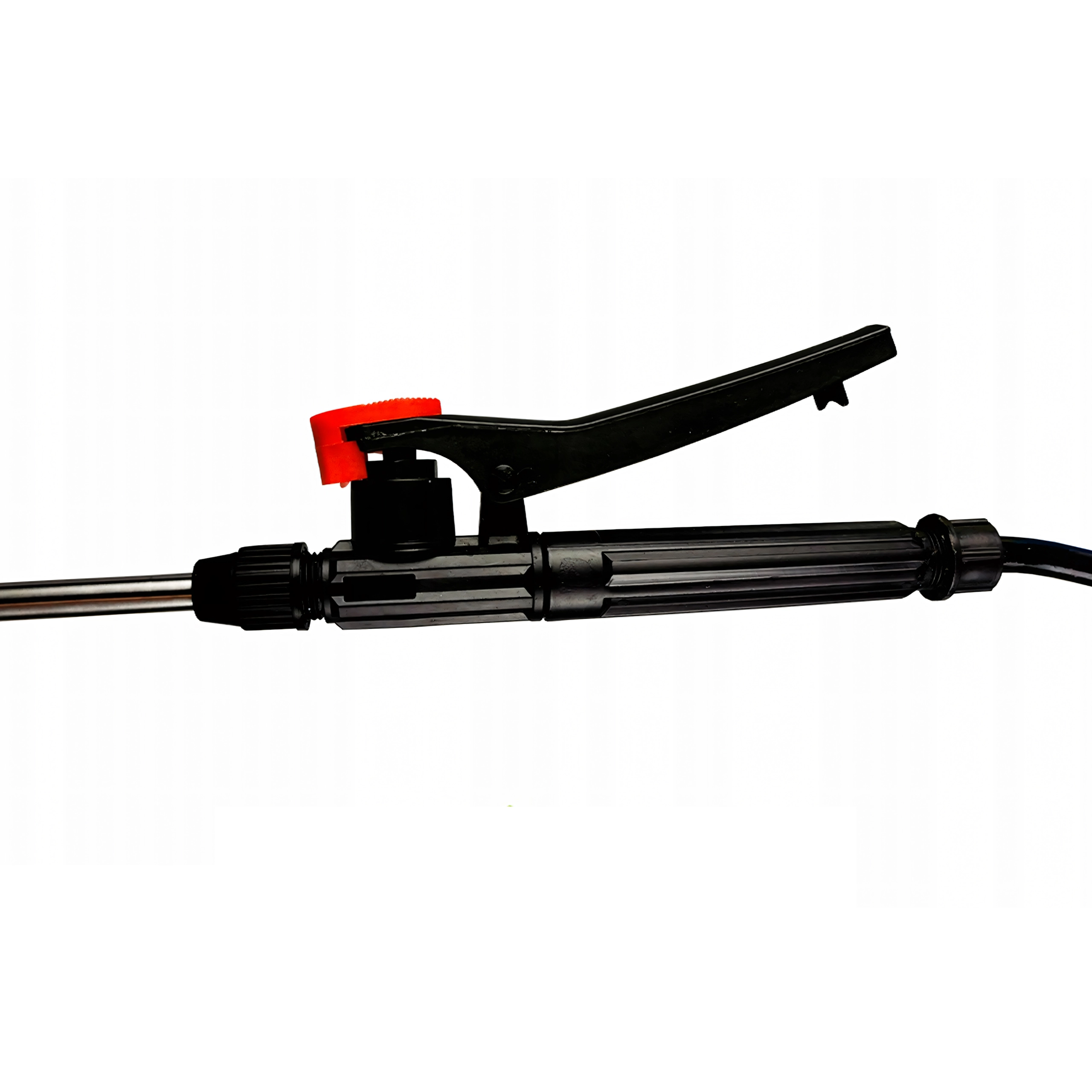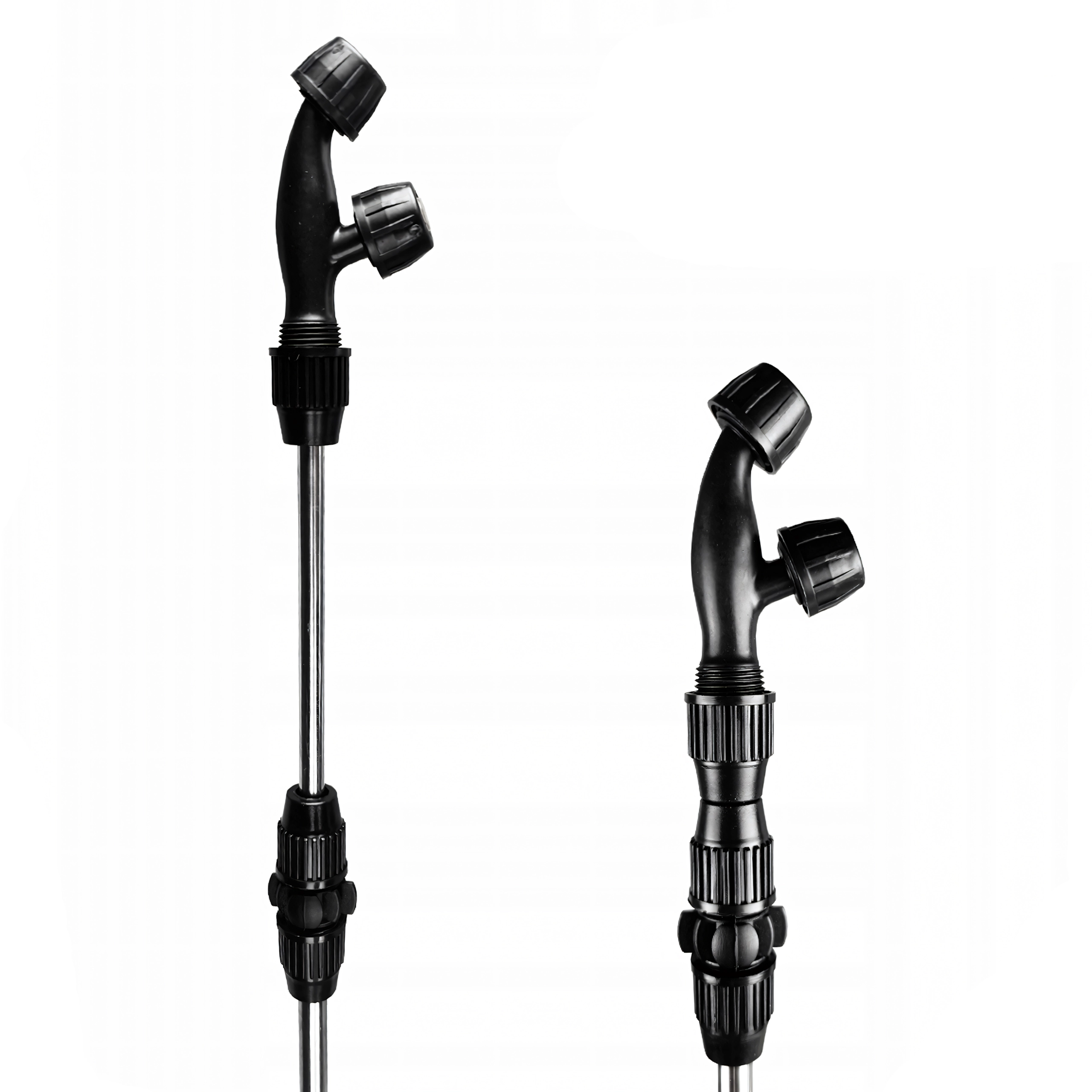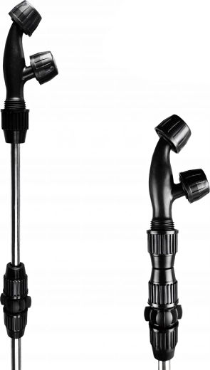 En lang metalstav med pistolgreb og regulering muliggør målrettet påføring og sikker rækkevidde selv i tætte bevoksninger.
