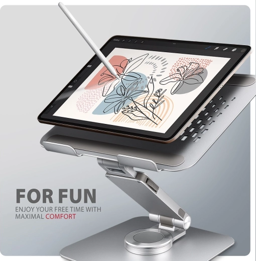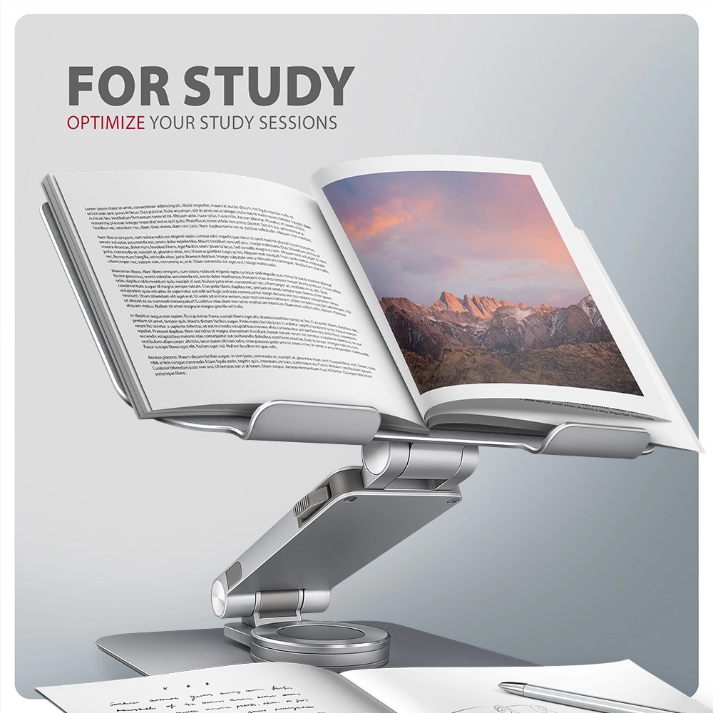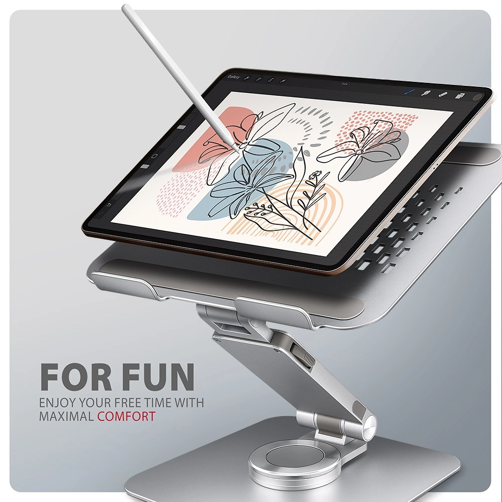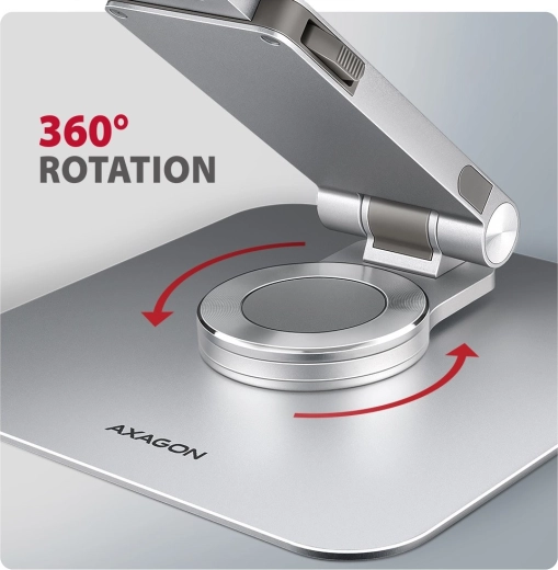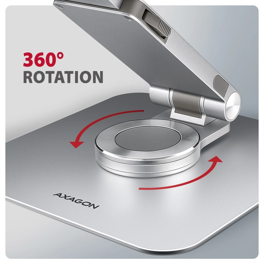 AXAGON STND-LR er en gennemtænkt stand til bærbare og tablets, der øger ergonomien både hjemme og på kontoret. 360° rotation gør det nemt at dele skærm eller ændre orientering uden at flytte basen, mens dobbeltled og hældningsregulering hjælper med at indstille den ideelle højde og vinkel for at aflaste nakken.