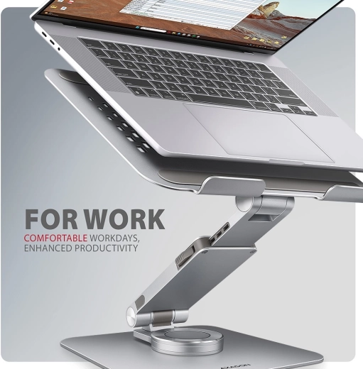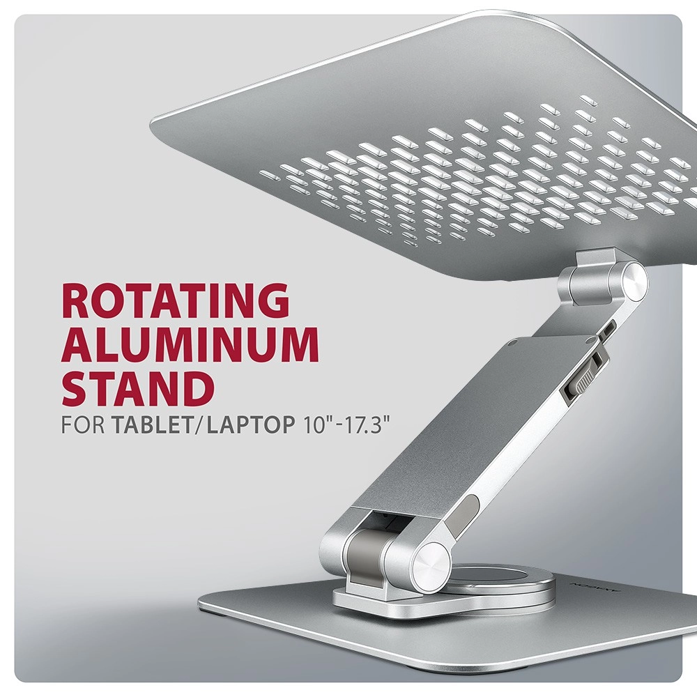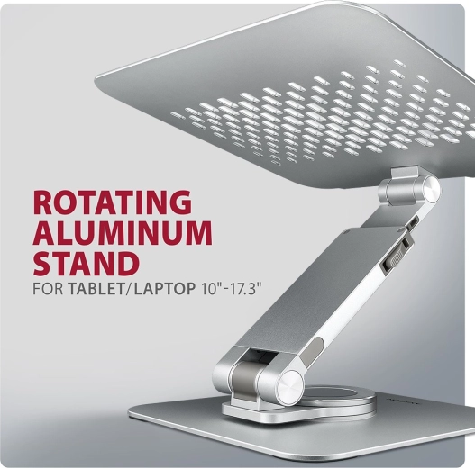 Ergonomisk aluminiumsstand til bærbar computer AXAGON STND-LR med 360° drejemekanisme, højdejustering og justerbar hældning forbedrer komforten under arbejdet. Velegnet til enheder 10–17,3″, tilbyder en udtrækkelig arm med lås, stabil metal konstruktion og skridsikre flader for sikker brug samt bedre varmeafledning.