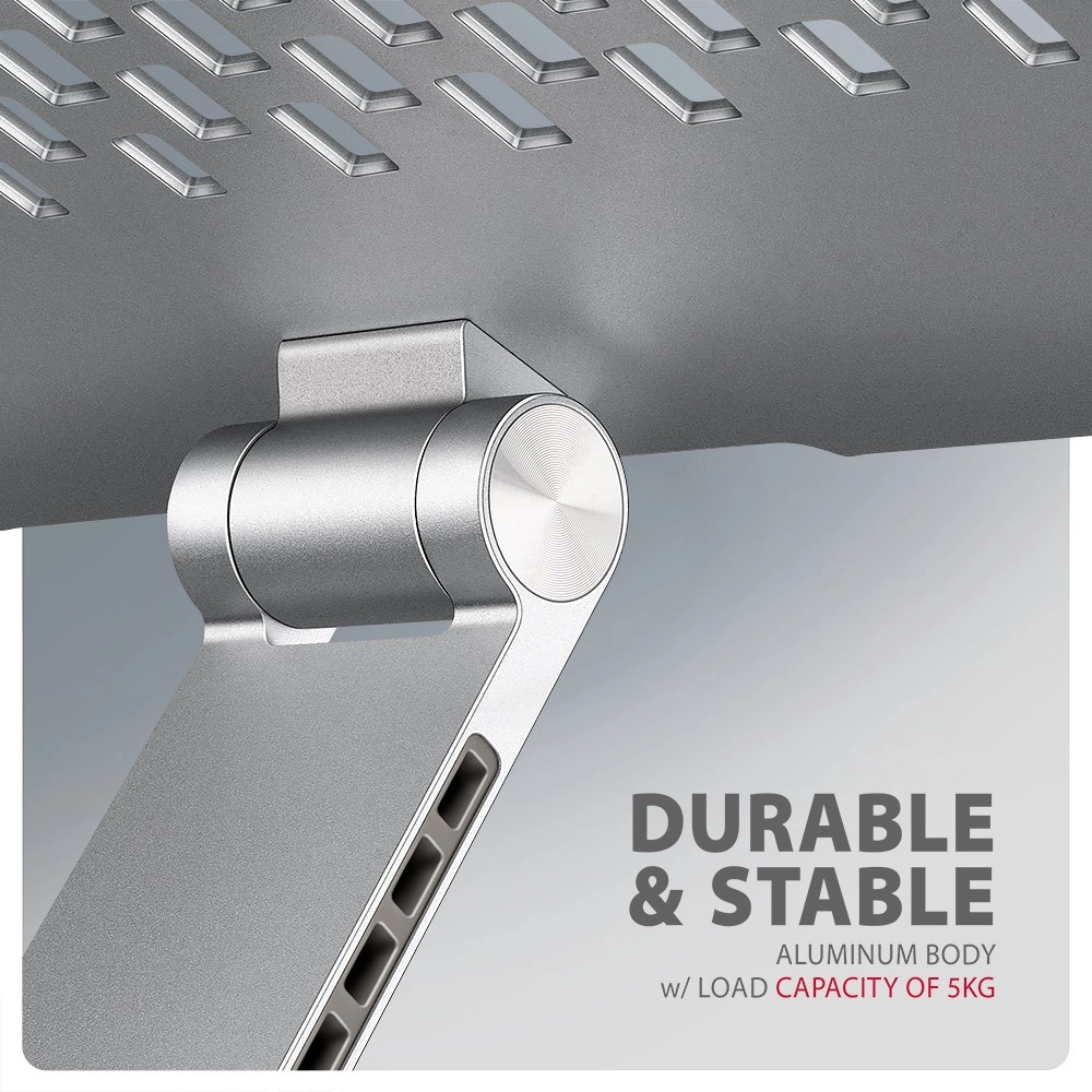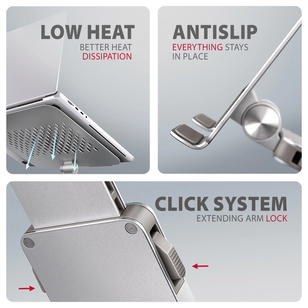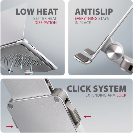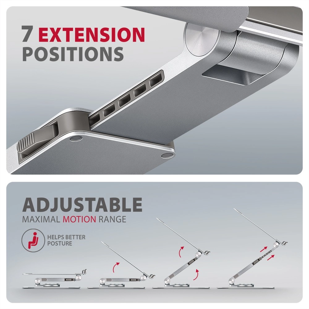 Den unikke udtrækkelige arm med lås (op til 60 mm, 7 positioner) bringer skærmen tættere på den optimale synsafstand og flugter den med en ekstern monitor. Aluminiumsstøbninger sikrer styrke og lang levetid, skridsikker belægning holder enheden sikkert på plads, og ventilationsåbninger understøtter effektiv køling for højere ydeevne og længere levetid for den bærbare.