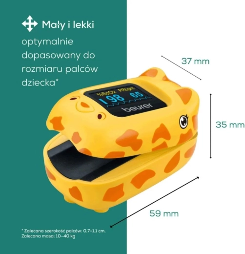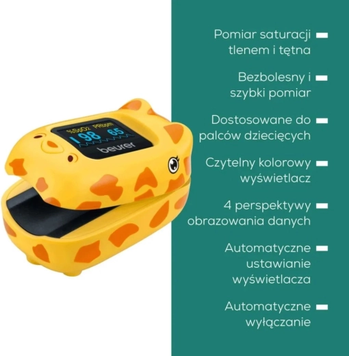 Det børnevenlige pulsoximeter Beurer PO 13 Kids i en sød giraf-form tilbyder smertefri måling af iltmætning (SpO2) og puls på få sekunder. Det er tilpasset små børnefingre, har en farveskærm med automatisk orientering og leverer pålidelige resultater til hjemmebaseret sundhedskontrol.