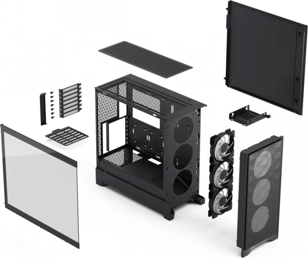Understøtter topmonterede radiatorer på op til 360 mm og CPU‑luftkølere op til 170 mm. Magnetisk topfilter og værktøjsfri adgang gør rengøring og opgraderinger hurtige.