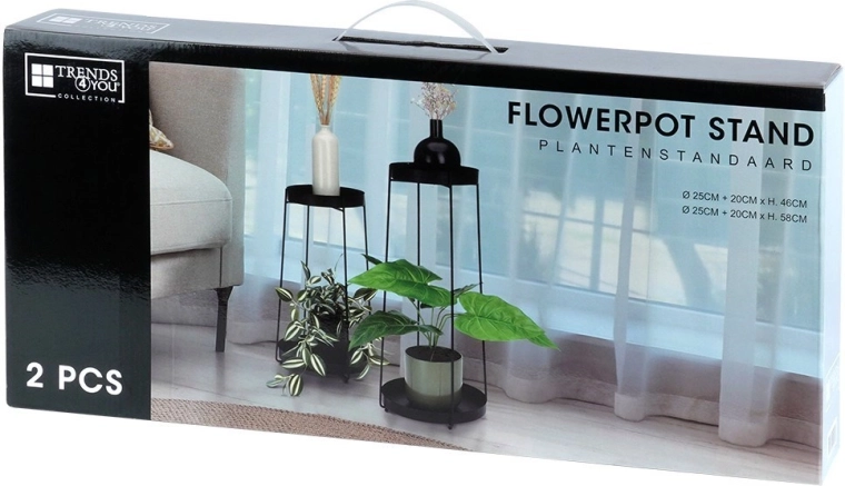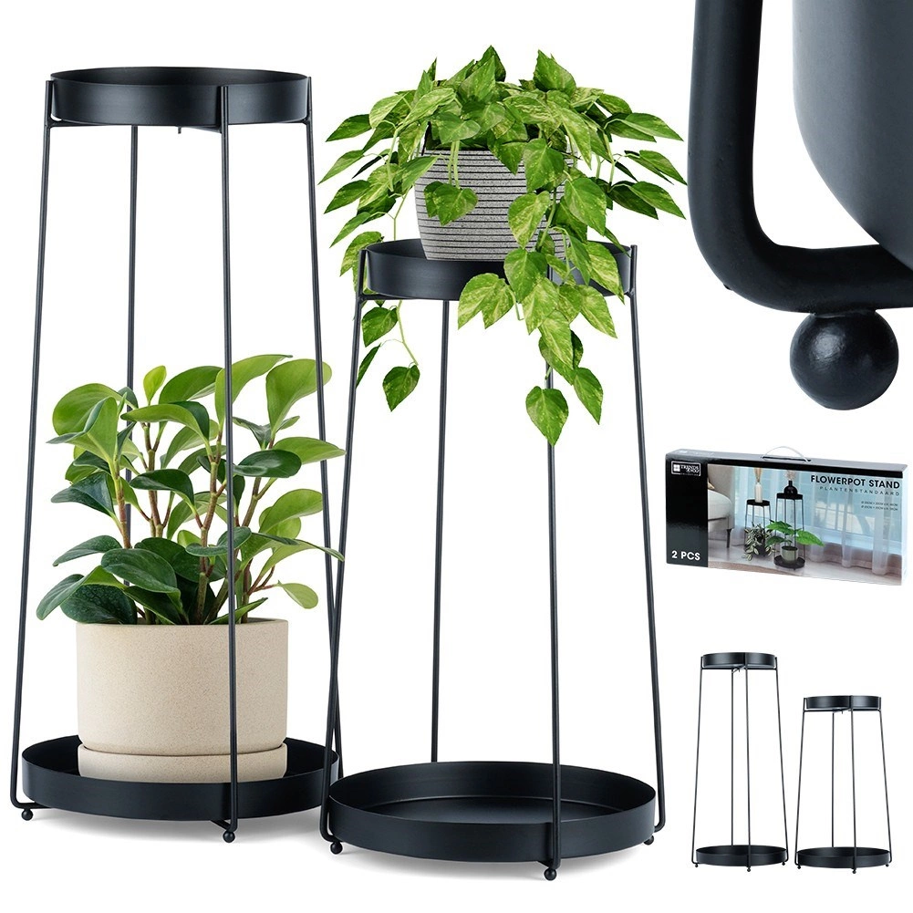 Sættet inkluderer to standere i højderne 46 og 58 cm med aftagelige bakker for nem rengøring og flytning af planter. Takket være den stabile metal-konstruktion bærer de sikkert de fleste almindelige urtepotter og egner sig også til dekorationer og små accessories.