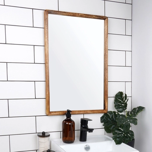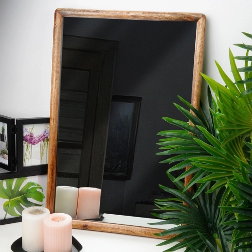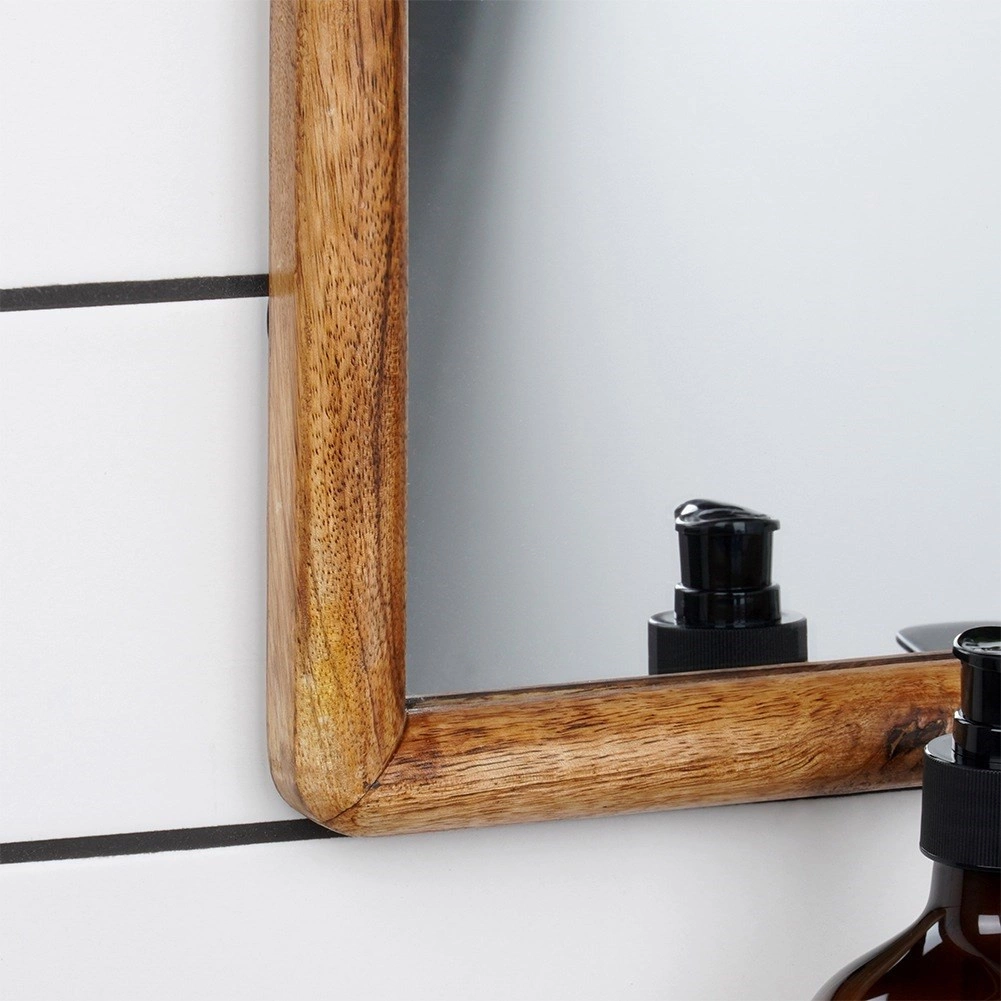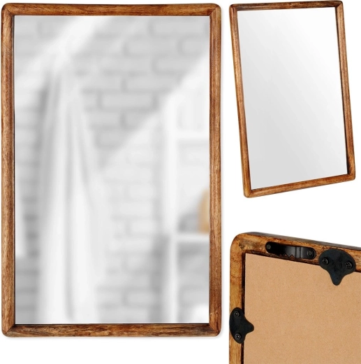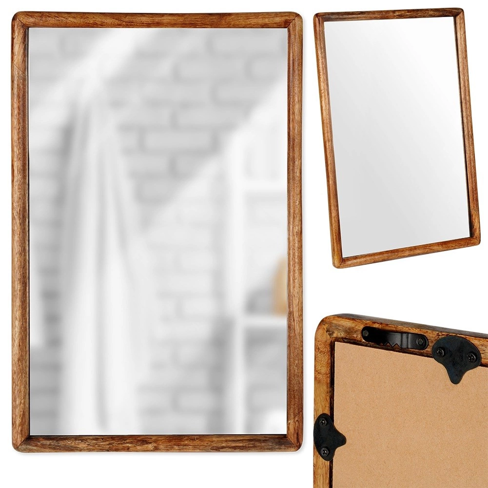 Elegant væghængt spejl i størrelsen 40 × 60 cm med en naturlig træramme af mangotræ, som tilfører stil og lys til indretningen. Kan hænges både vertikalt og horisontalt og passer perfekt i stue, entré og soveværelse. Giver en klar og skarp refleksion og bliver et både praktisk og dekorativt element i ethvert rum.