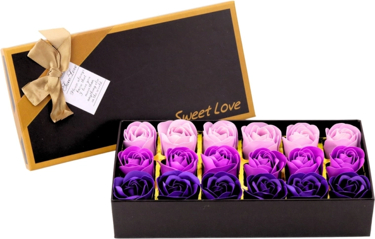 Sæt med 18 roser i en glidende overgang fra lyserød til dyb lilla skaber en harmonisk komposition.