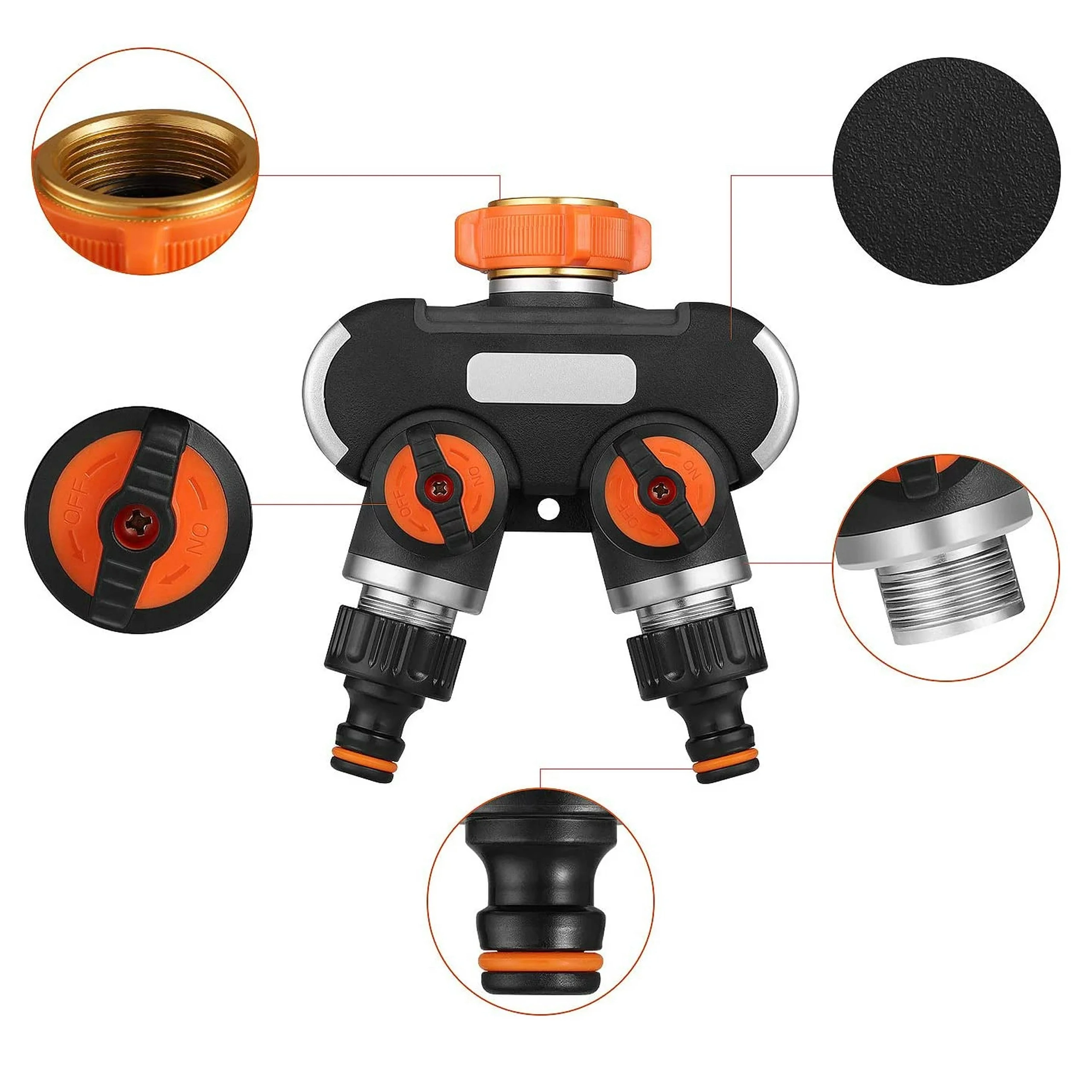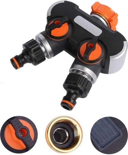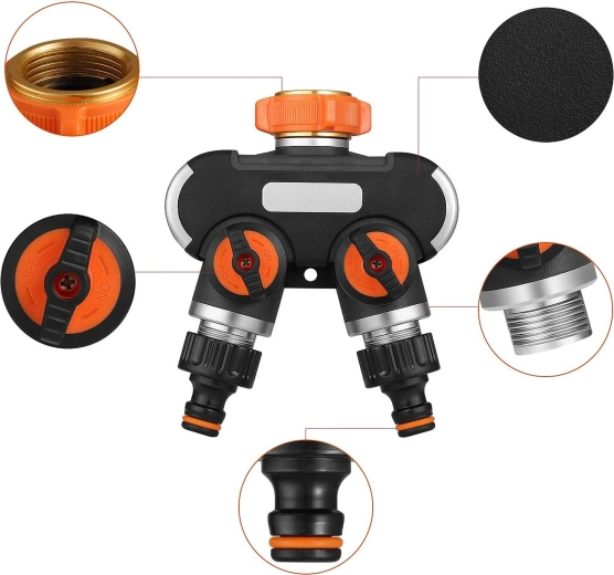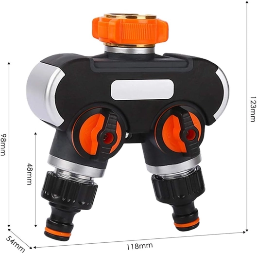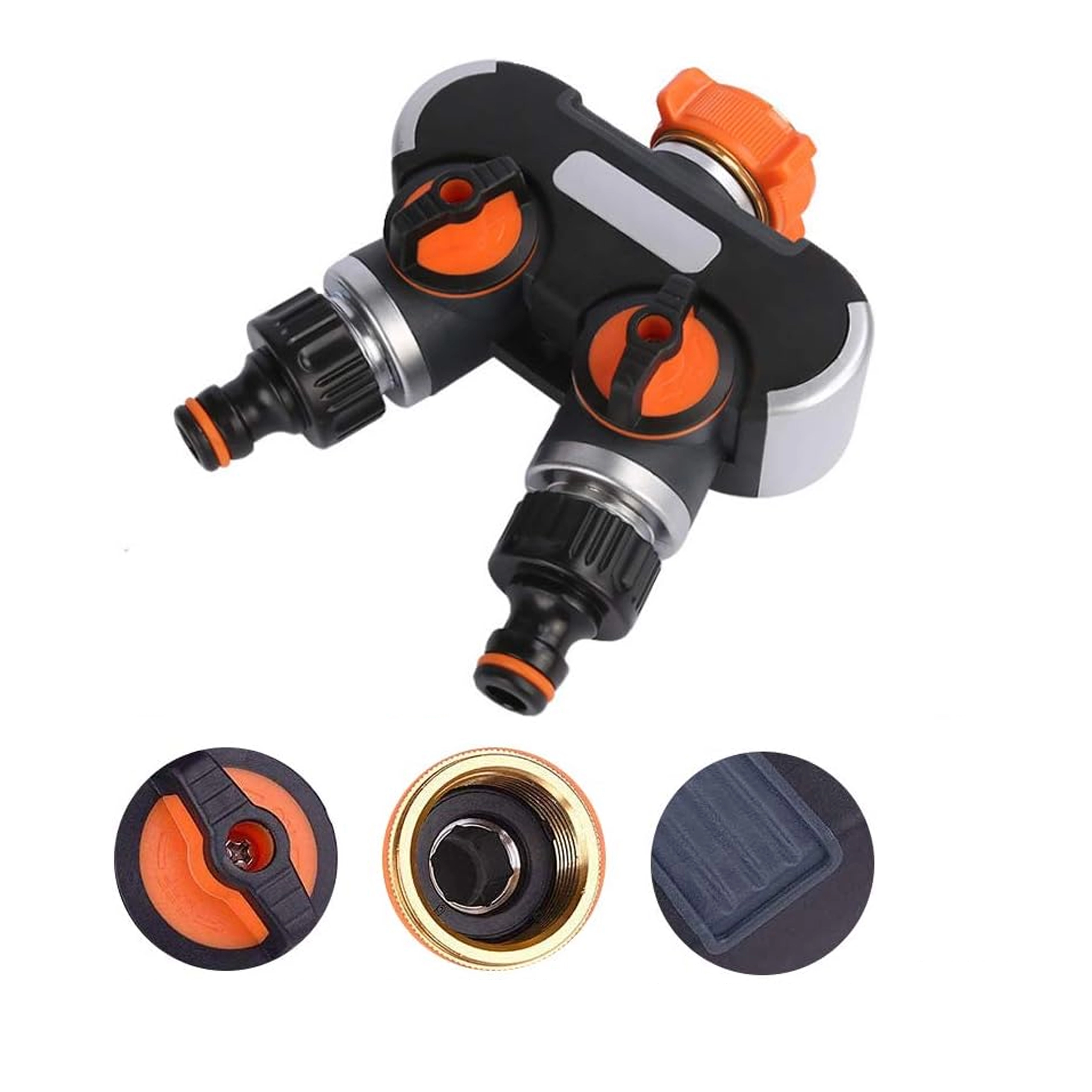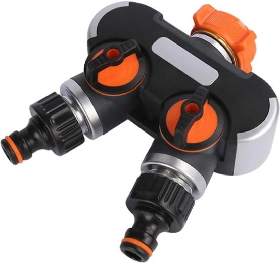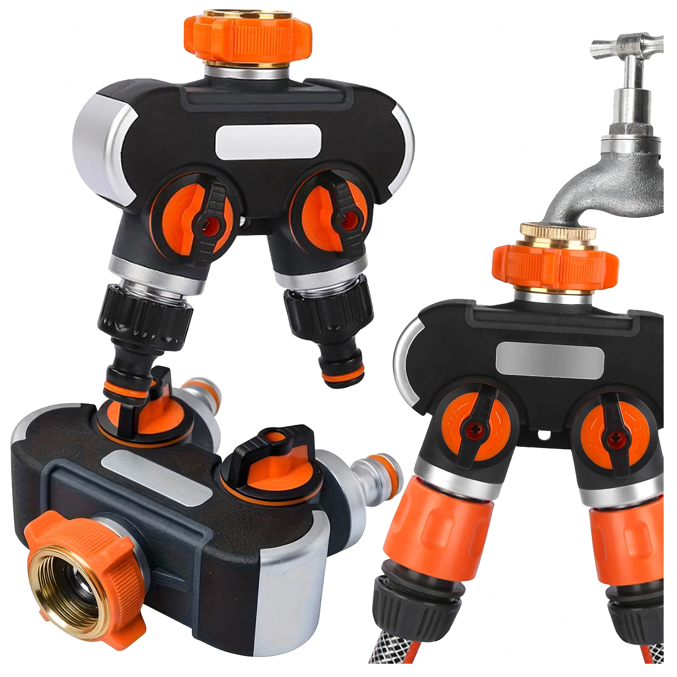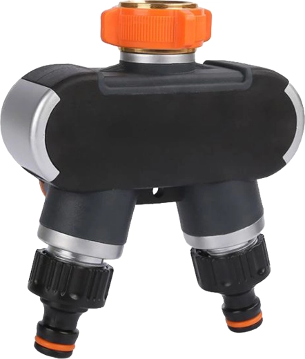 Praktisk tovejs fordeler, der forvandler én hane til to uafhængigt styrede udgange. Hver udgang har sin egen ventil for præcis regulering af gennemstrømningen samt lynkoblinger for nem tilslutning af slanger. Ideel til samtidig vanding og drift af sprinkler. Den robuste konstruktion og ergonomiske betjeningsdele sikrer lang levetid og komfortabel brug. Tovejs udgang, uafhængig flowregulering, hurtig tilslutning af slanger, nem montering.