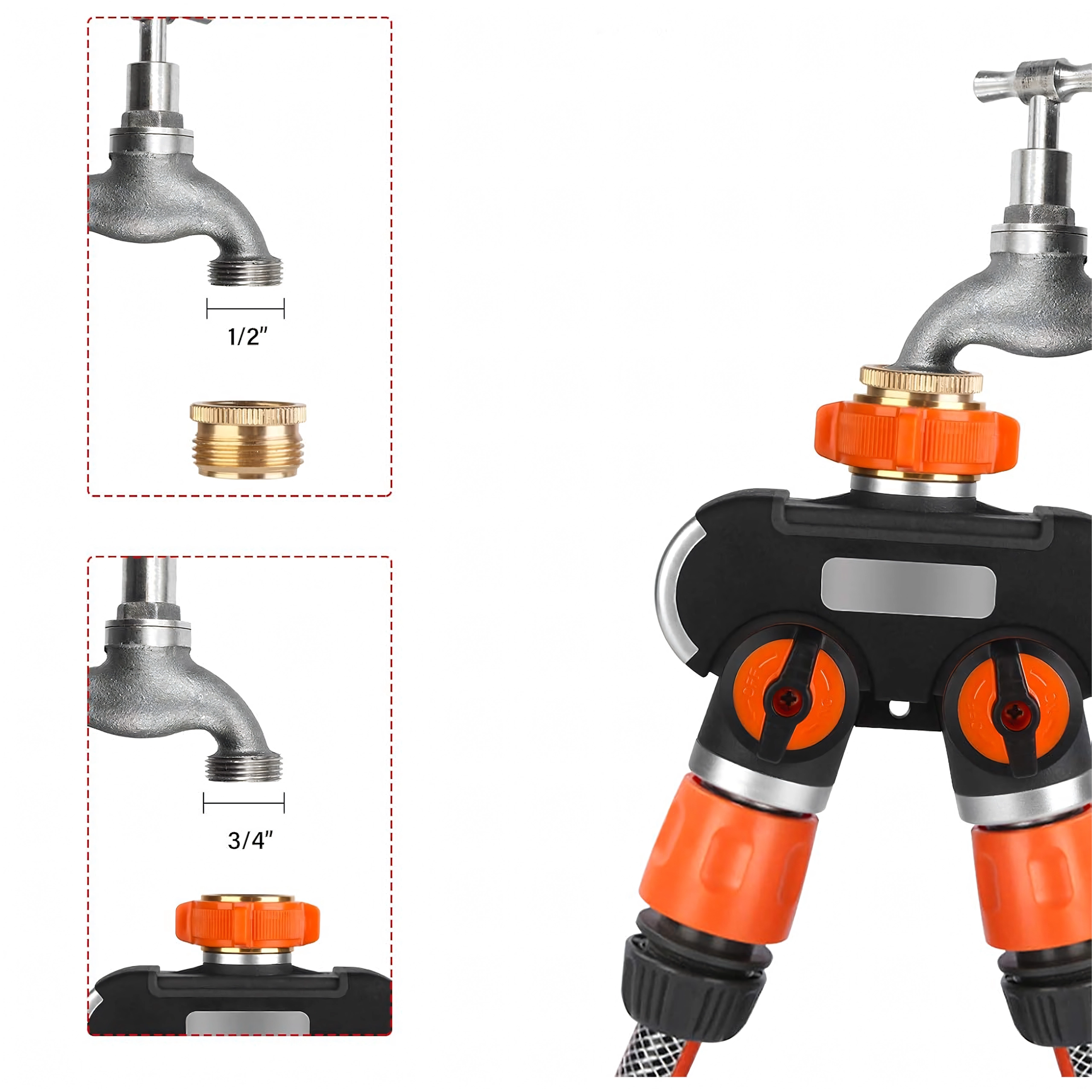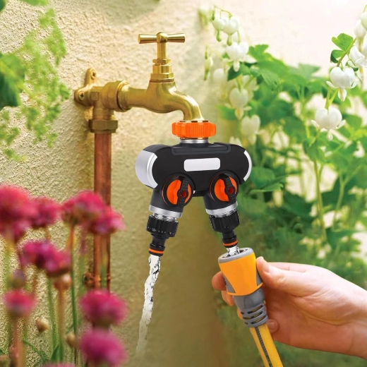 Fordeleren til havehanen gør det muligt at tilslutte to slanger til én vandkilde og styre hver enkelt separat. Takket være to uafhængige ventiler indstiller du flowet præcist efter behov – fra blid drypvanding til fuld stråle. Lynkoblingerne sikrer hurtig og tæt tilslutning uden brug af værktøj.
