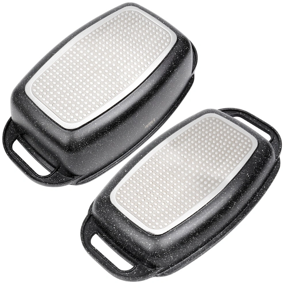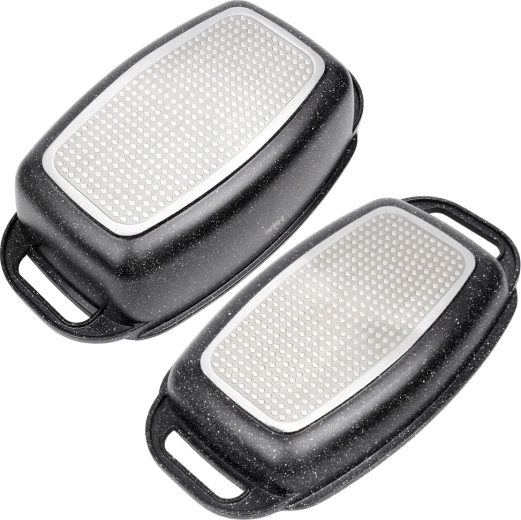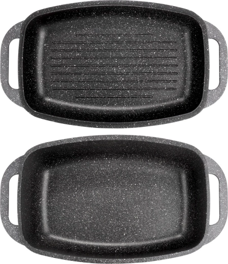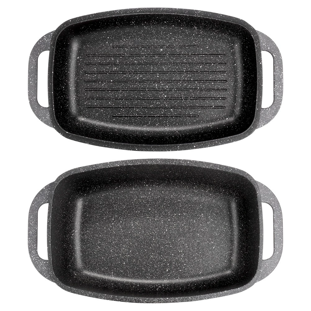 Bradepanden er lavet af holdbart aluminiumstøbegods med non-stick granitbelægning, som muliggør madlavning med minimalt olieforbrug og nem rengøring. Materialet akkumulerer varmen fremragende, så retterne forbliver varme længere og bliver jævnt tilberedt. Ergonomiske håndtag på begge dele sikrer sikker håndtering.