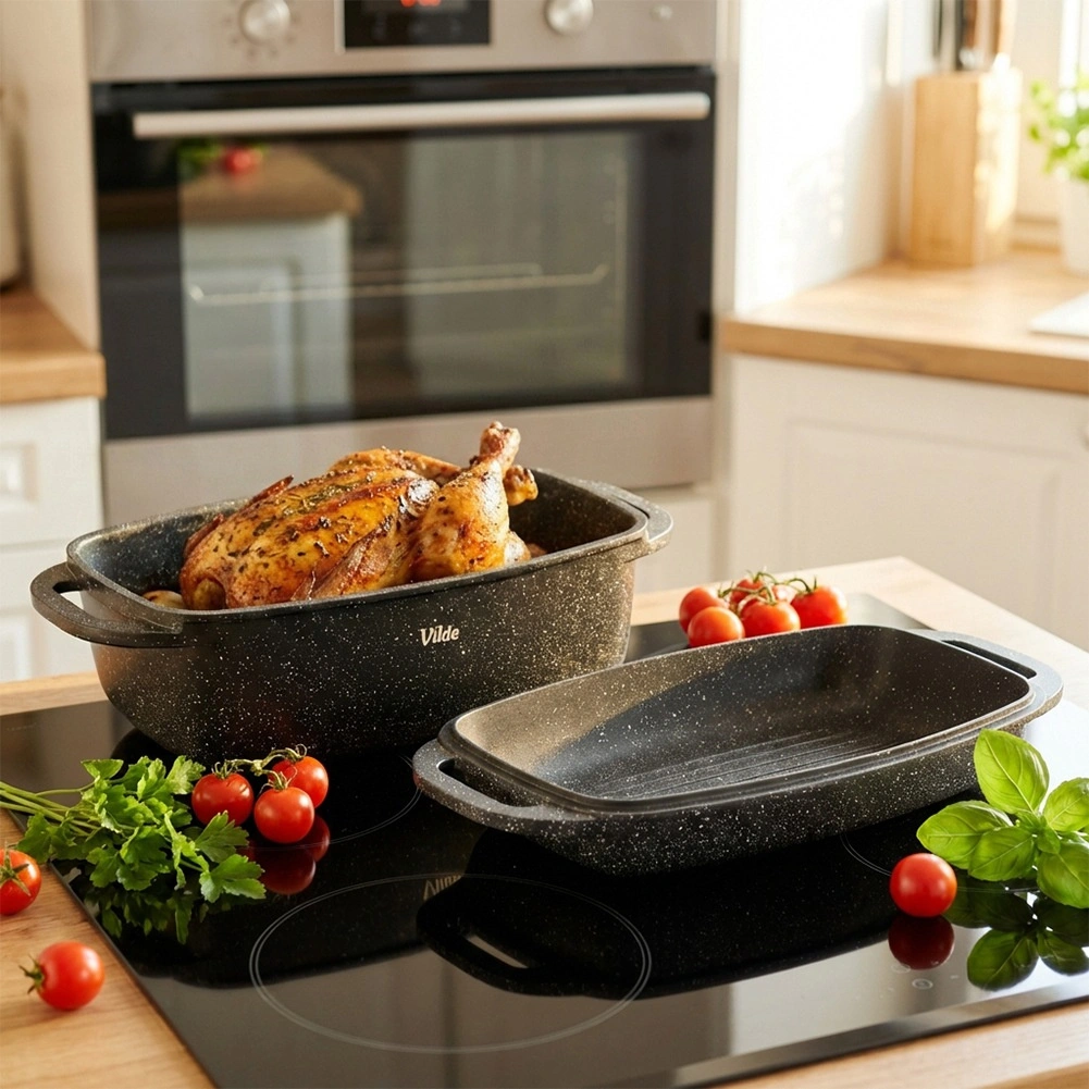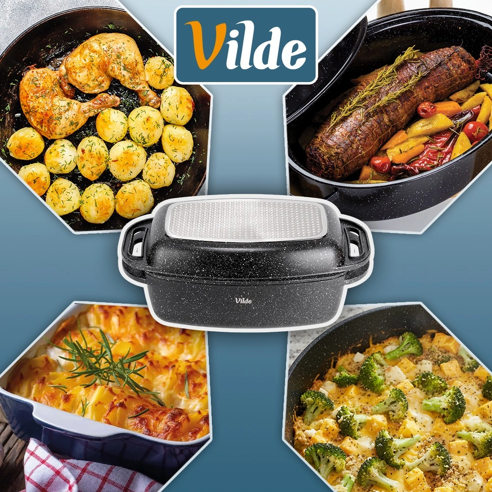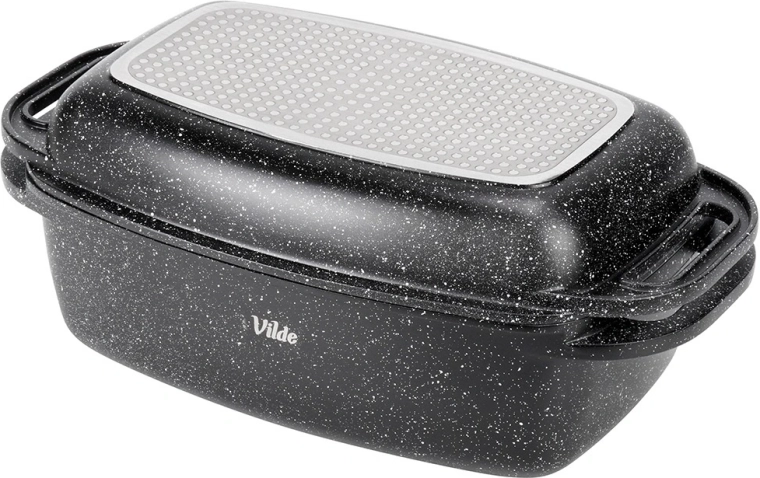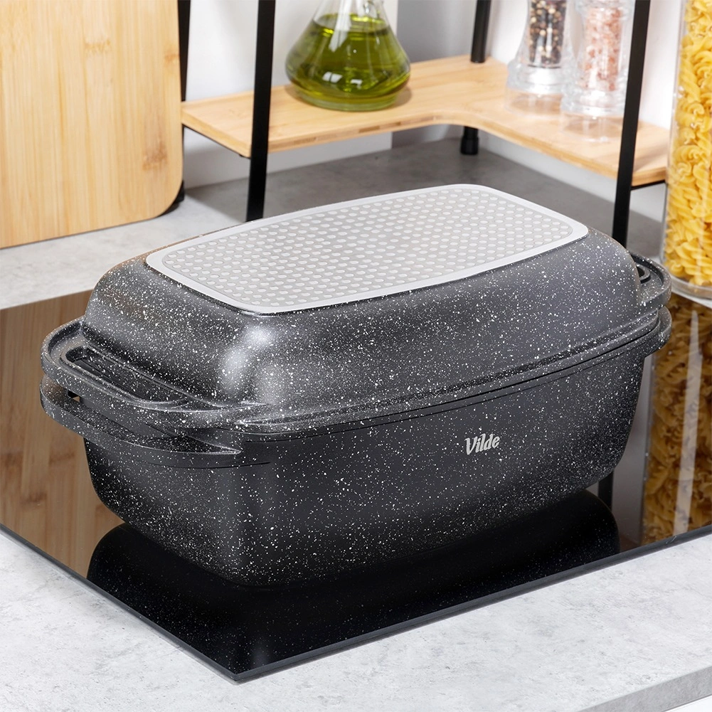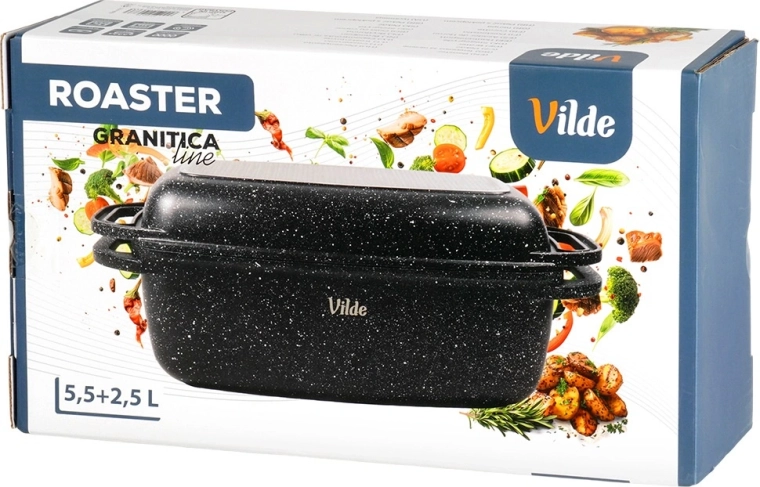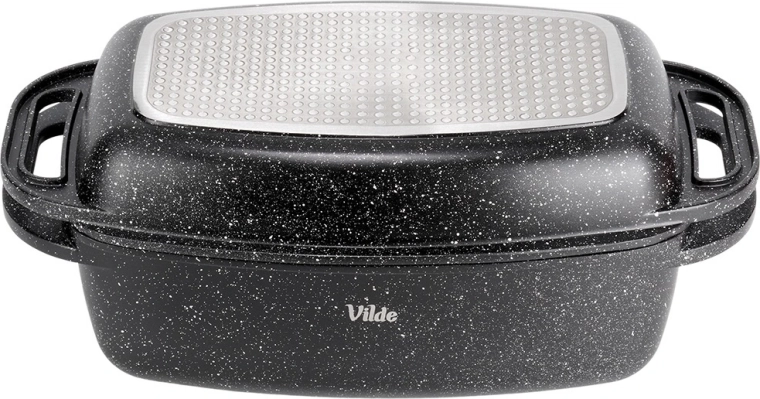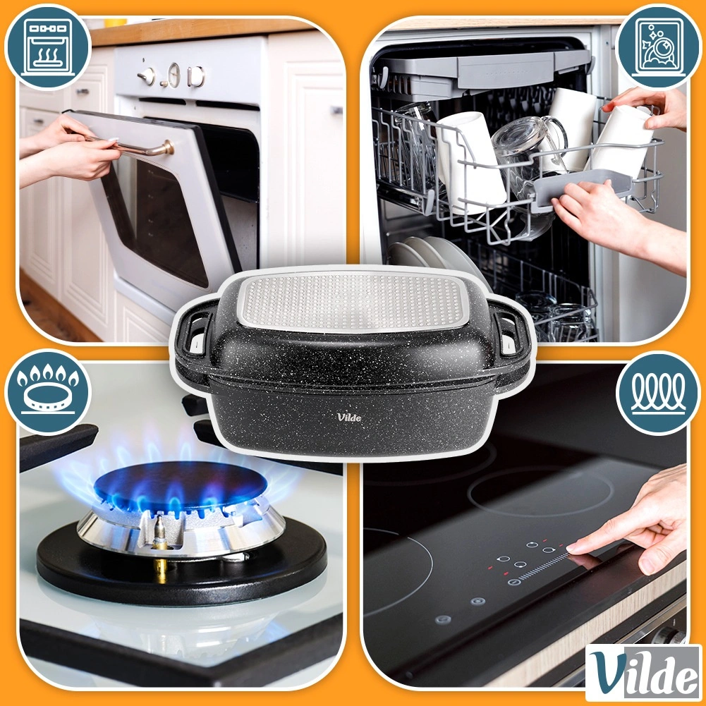 Alsidig brug: ovn op til 250 °C, gaskomfur, elektrisk, glaskeramisk og induktion. Efter madlavning kan den nemt sættes i opvaskemaskinen. Originalt produkt VILDE – Granitica Line, fremstillet efter europæiske standarder.