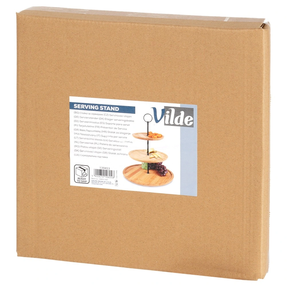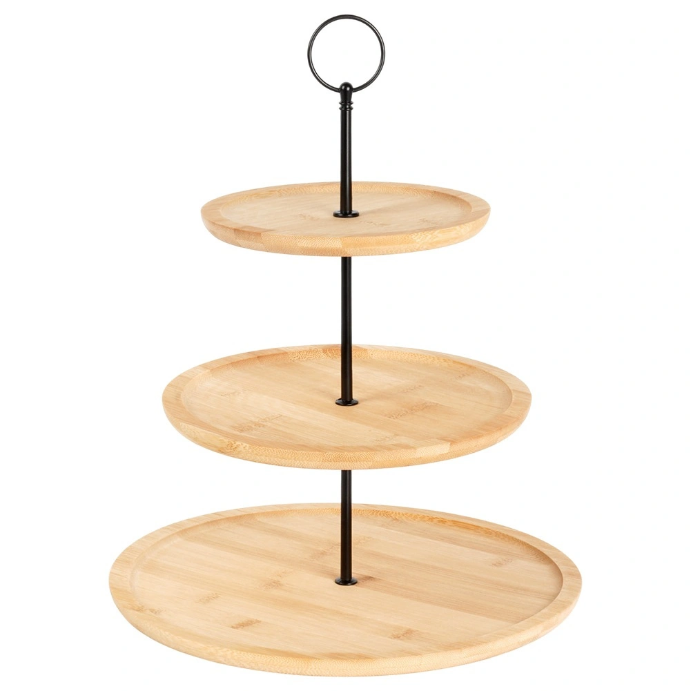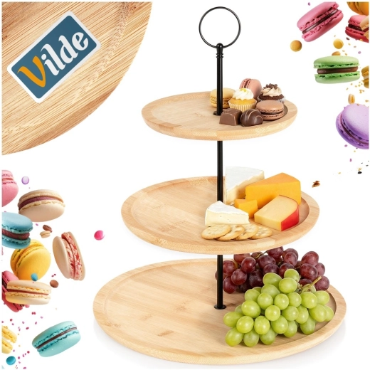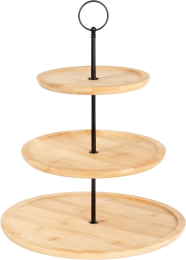 Denne elegante bambus etagere giver praktisk, fler-niveaus servering i naturlig stil. Takket være tre runde etager med gradvist større diameter kan du nemt servere cupcakes, makroner, småkager, oste, frugt og salte canapéer. Den stabile metalkonstruktion i sort med øverste ring gør transporten nem og tilfører et moderne udtryk.