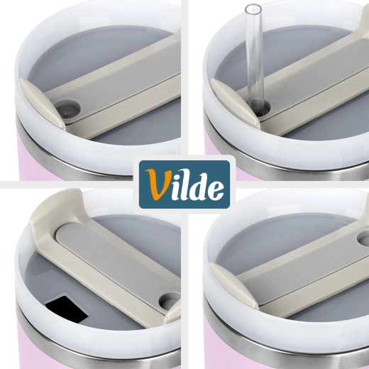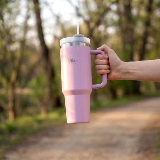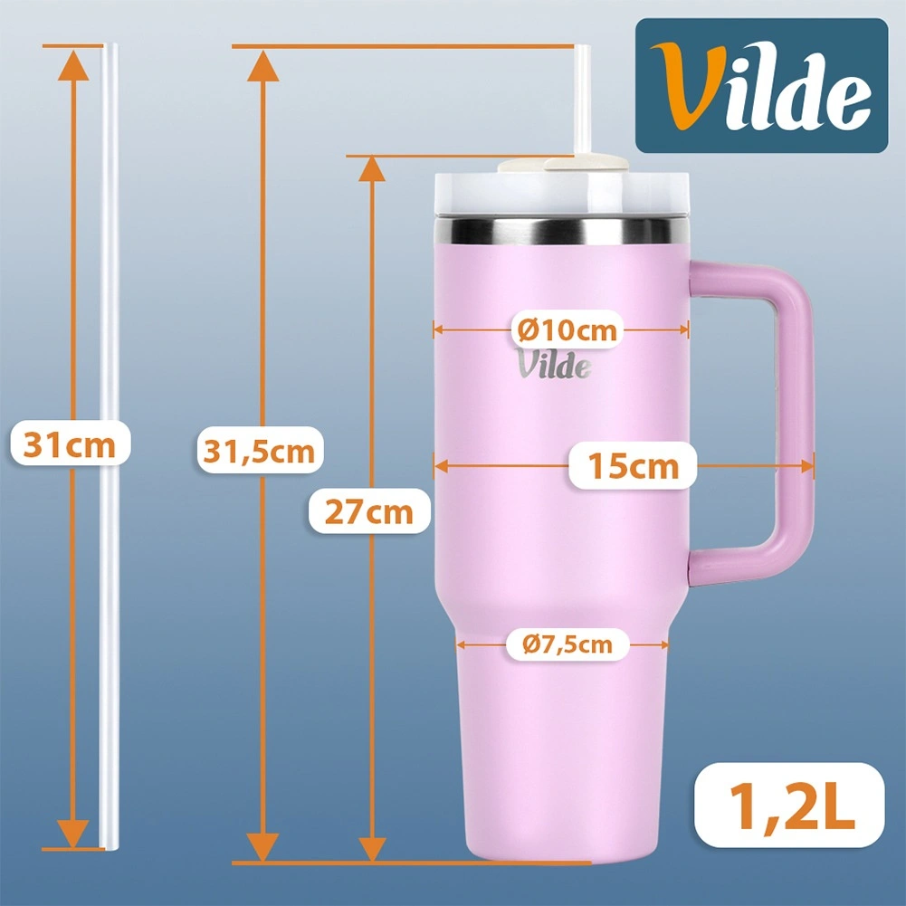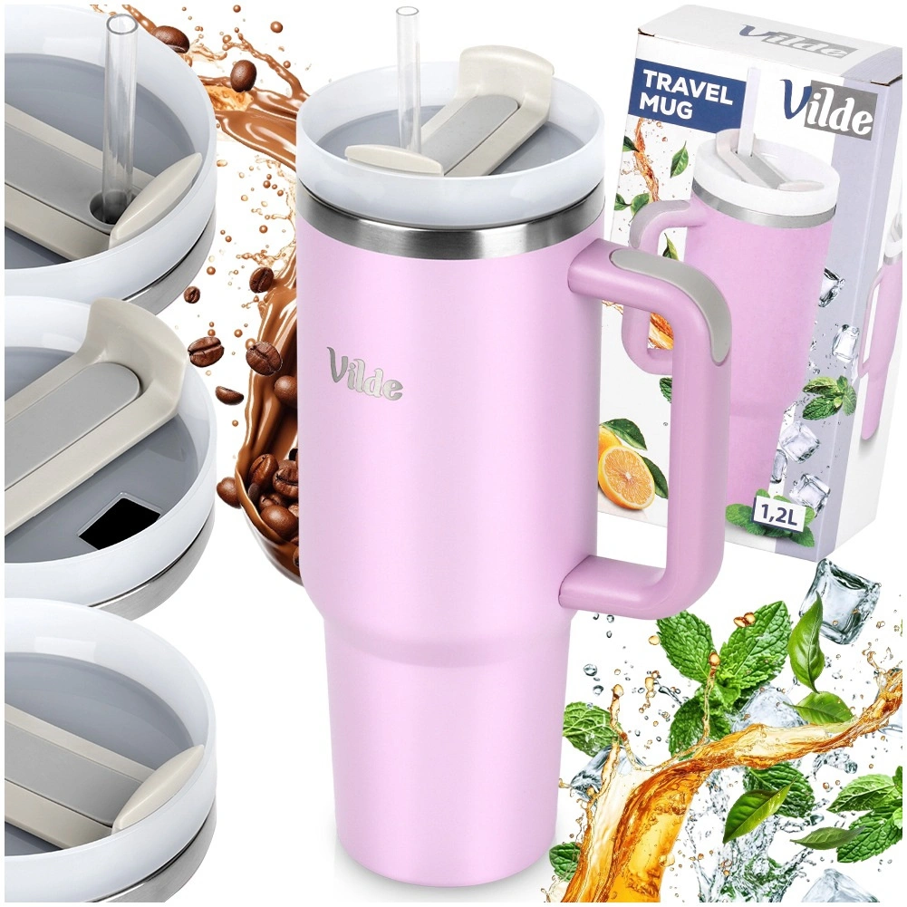 Termokop med stor kapacitet 1,2 l med vakuum-dobbeltvæg holder drikke varme i op til 12 timer og kolde i op til 8 timer. Den har et ergonomisk håndtag med skridsikre elementer, låg med drejelås og mulighed for at drikke gennem et sugerør eller gennem en åbning uden sugerør. Kroppen i rustfrit stål i rosa farve er holdbar og sikker til daglig brug derhjemme, på arbejde og på farten.