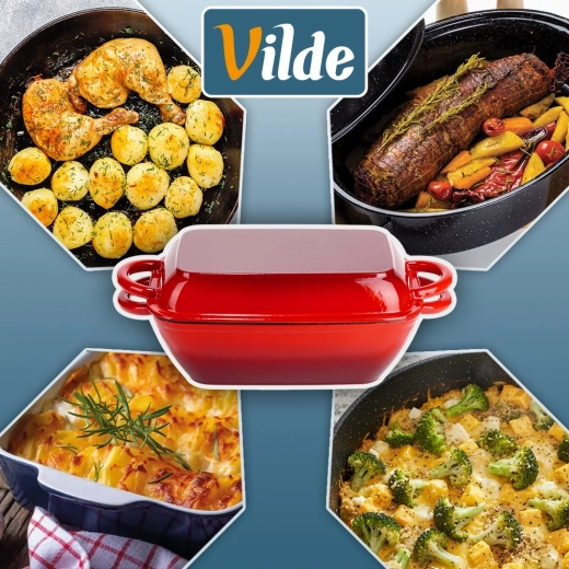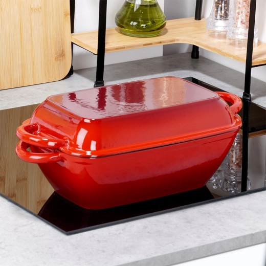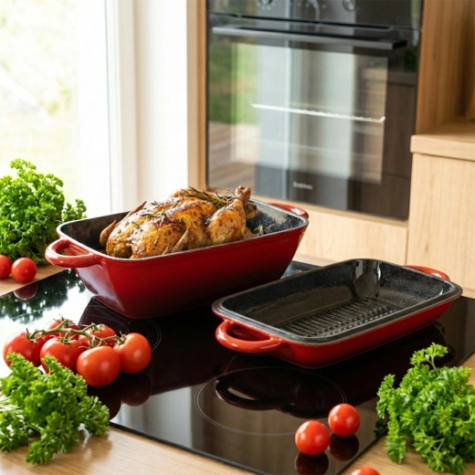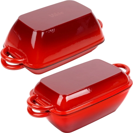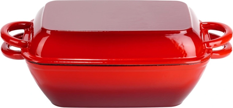Alsidigt støbejerns bradepandesæt 2-i-1 til bagning, braisering og gratinering. Låget fungerer som en selvstændig grillpande med rillet bund, selve bradepanden giver jævn varmefordeling og lang varmeholdning. Robust emaljeret udførelse, praktiske sidehåndtag og brug på alle typer komfurer inkl. induktion samt i ovn.