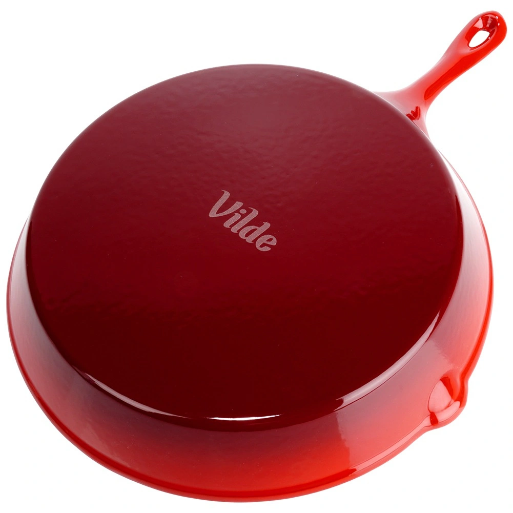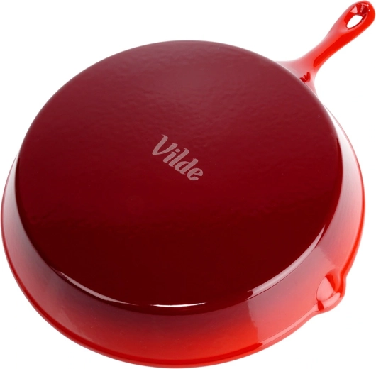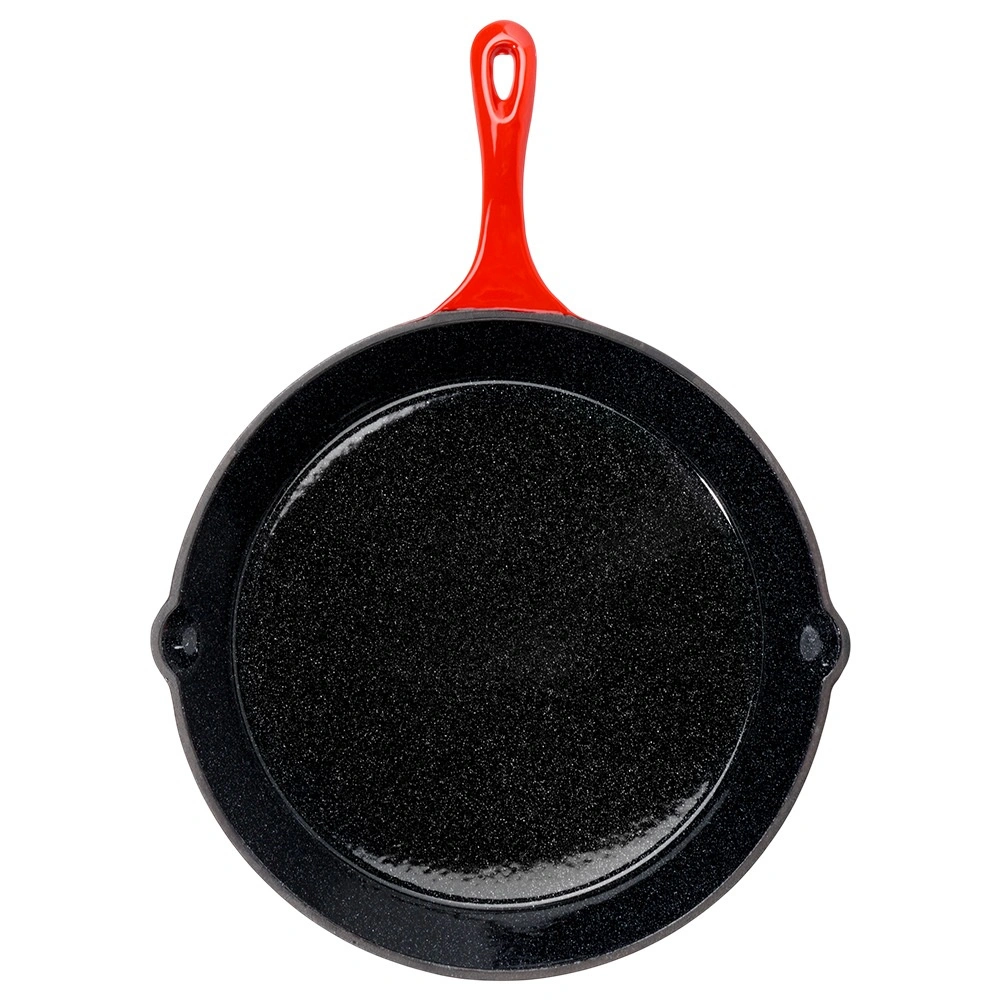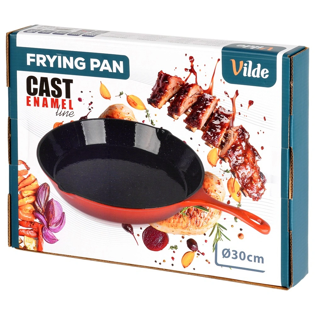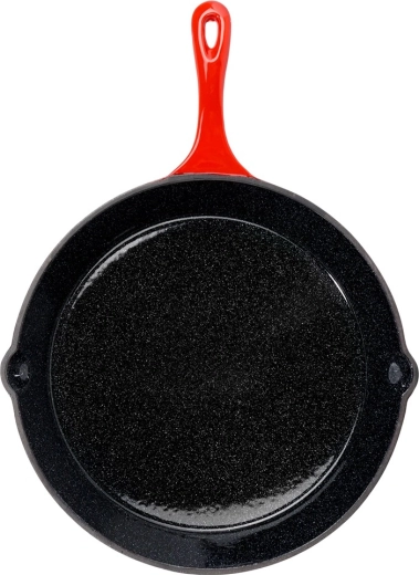 Robust støbejernspande 30 cm med sort emaljeret inderside, to hældetuder og rødt silikonehylster på håndtaget for sikker håndtering. Fremragende varmeledning og -lagring til jævn stegning, sautering og gratinering på komfur, grill og i ovn. Velegnet til gas, el, glaskeramik og induktion.
