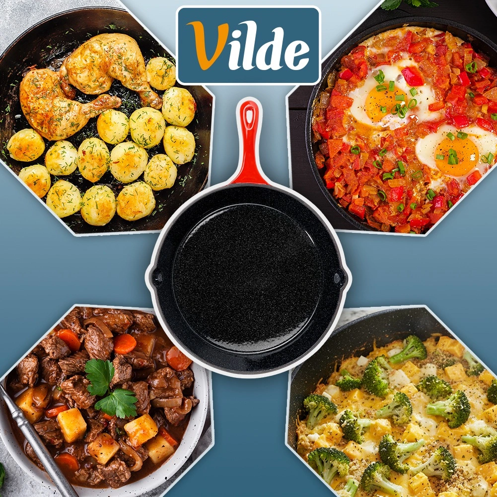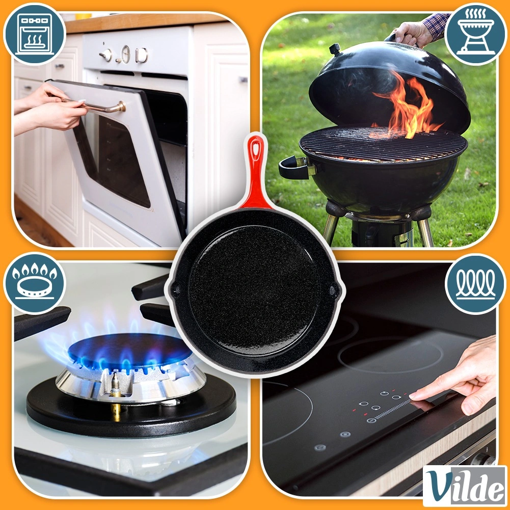 Hele pandens støbejernskrop med emaljeret overflade leder og lagrer varme fremragende. Maden bliver jævnt tilberedt og holder sig varm længere.