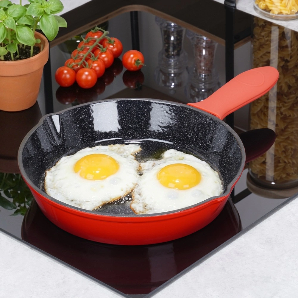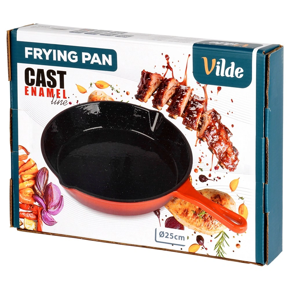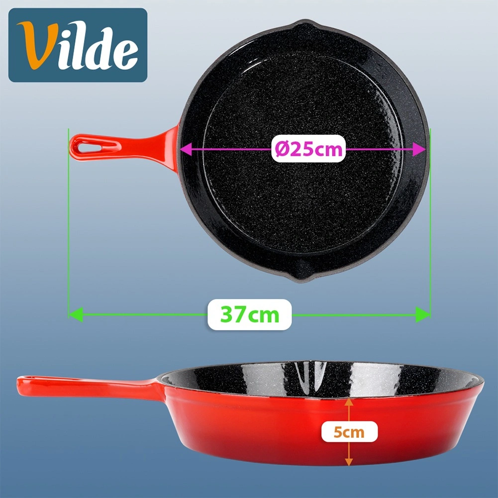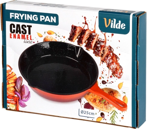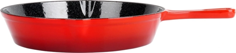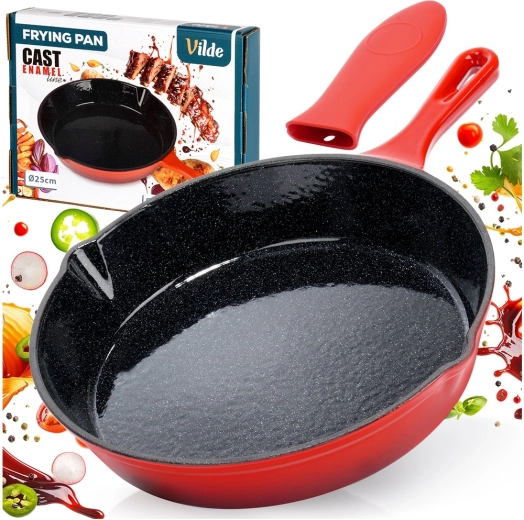 Robust støbejernspande med en diameter på 25 cm med sort nonstick-emaljeret inderside og rød yderside. Giver jævn varmefordeling, lang varmeholdning og er egnet til gas, el, keramik og induktion, til ovn og grill. Inkluderer et silikonehylster til håndtaget for sikker håndtering samt to udsnævringer for nem servering.
