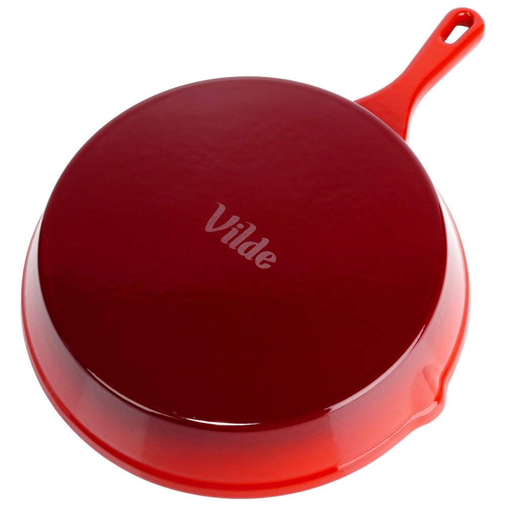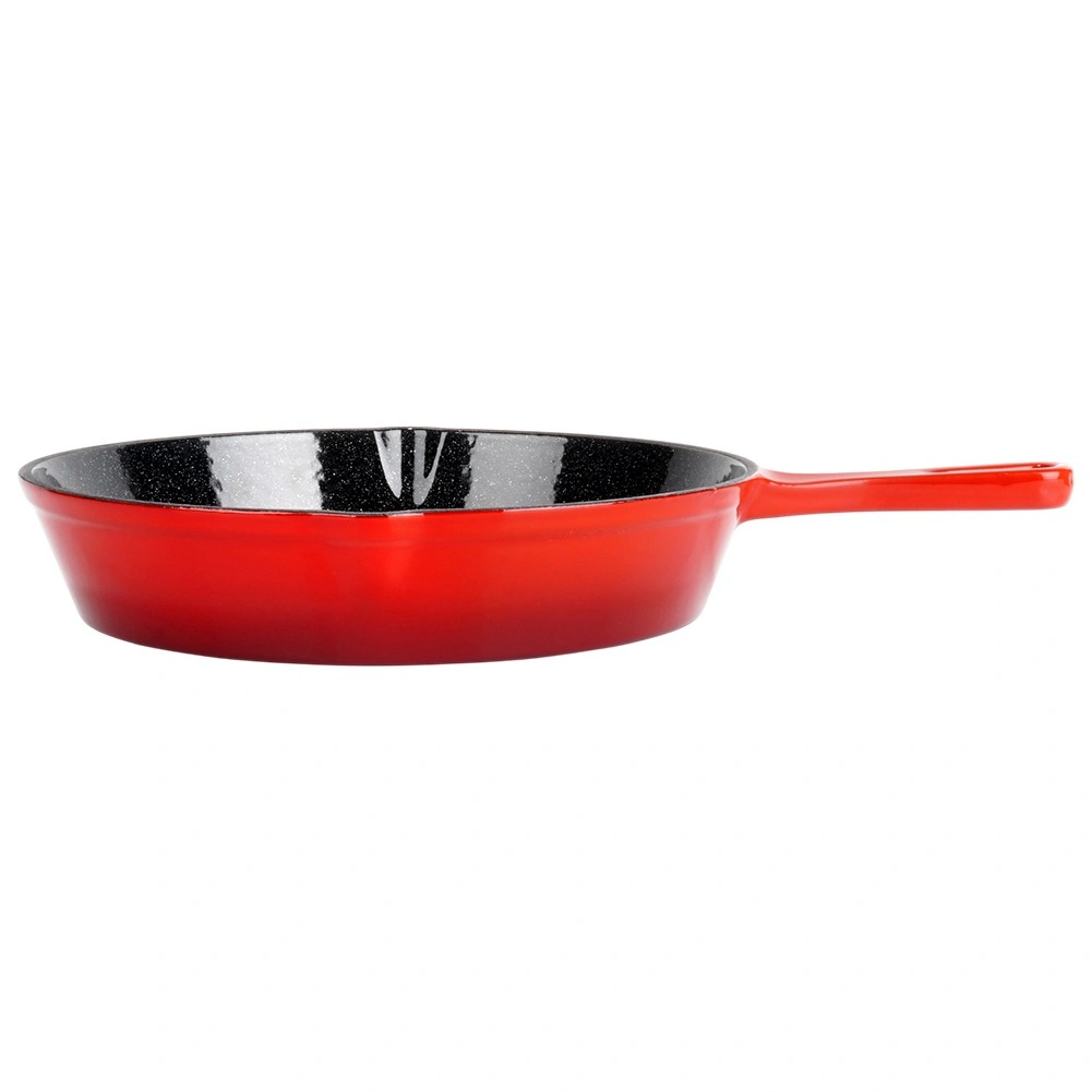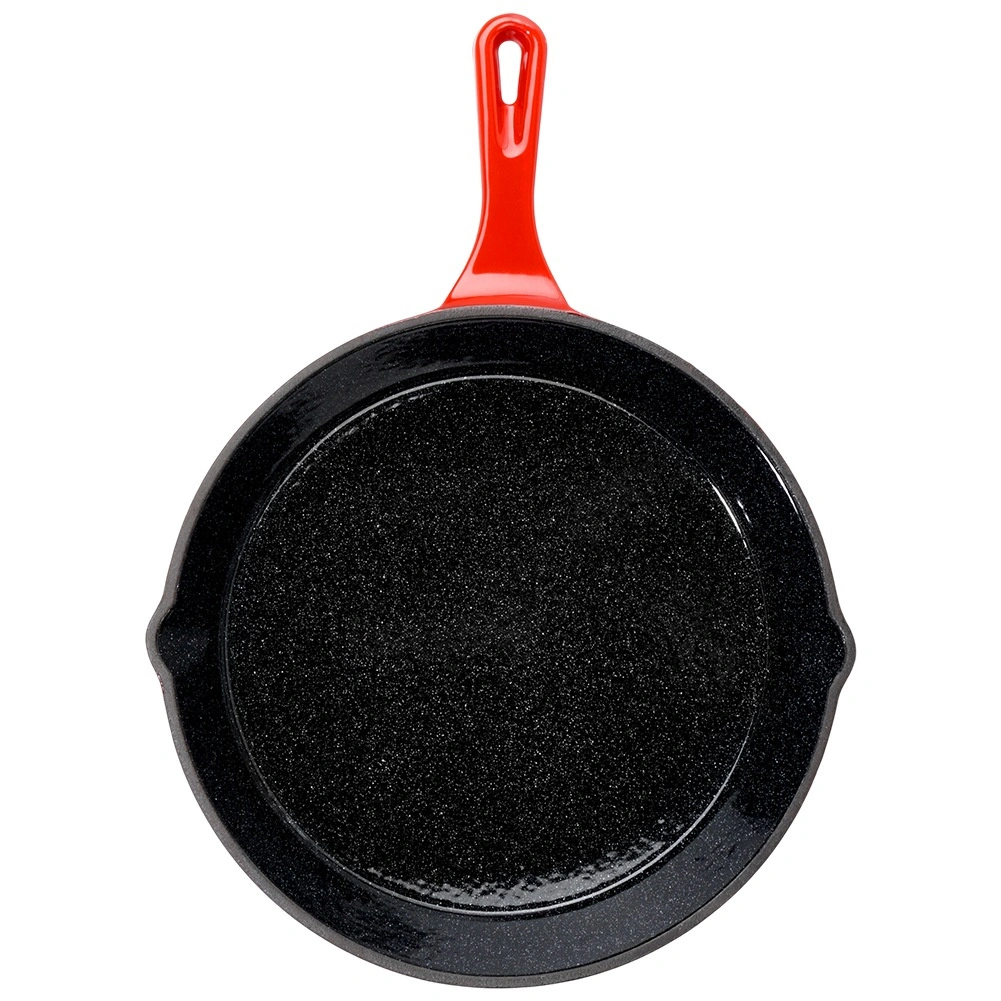 Den sorte emalje indvendigt minimerer fastbrænding og gør rengøringen lettere, mens den røde yderside giver panden holdbarhed og stil.
