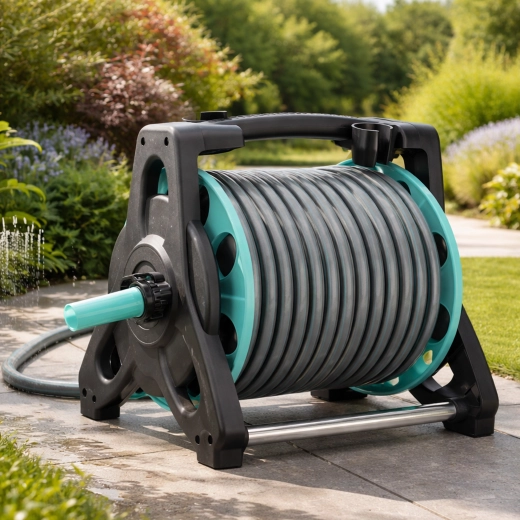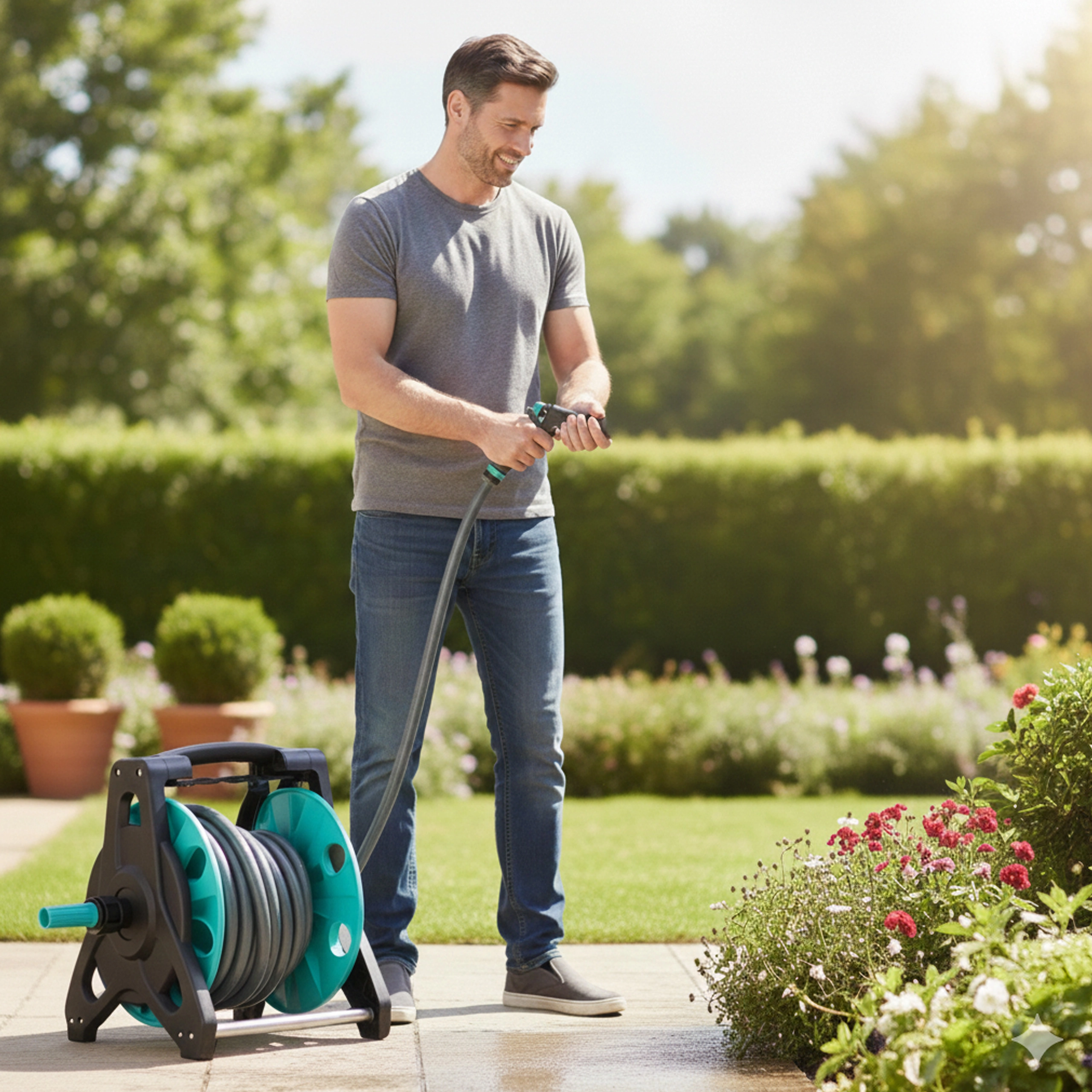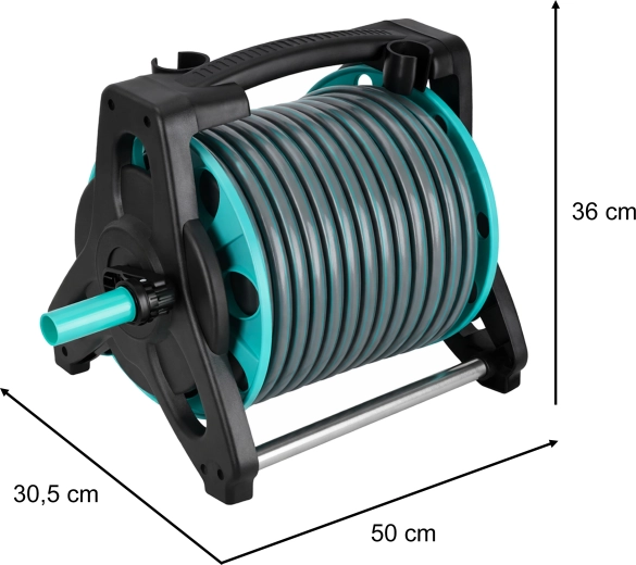 Dette komplette vandingssæt kombinerer en 30 m haveslange med et solidt stativ og tromle for hurtig oprulning. Takket være de kompakte mål og det nedfældelige håndsving sparer det plads, mens nem transport gør arbejdet omkring hus og have lettere. Den multifunktionelle pistol tilbyder præcis indstilling af strålen fra fin tåge til kraftigere bruser.