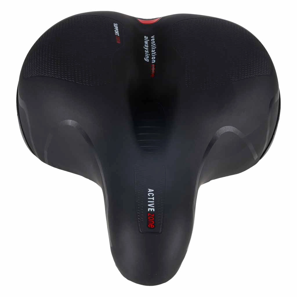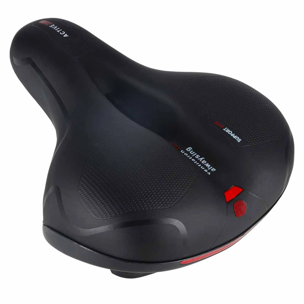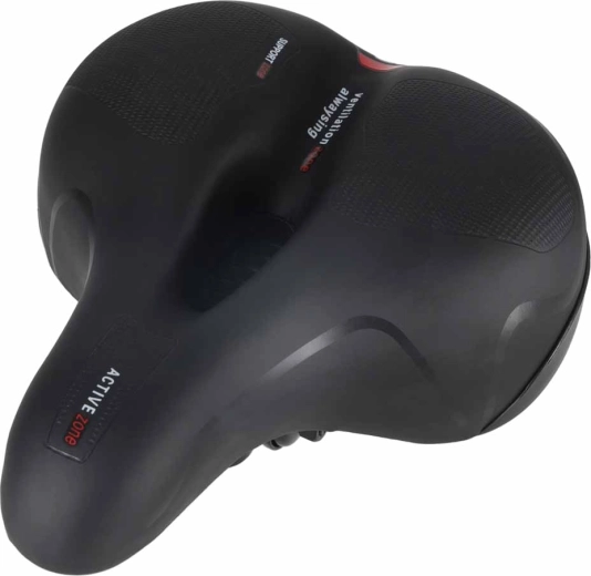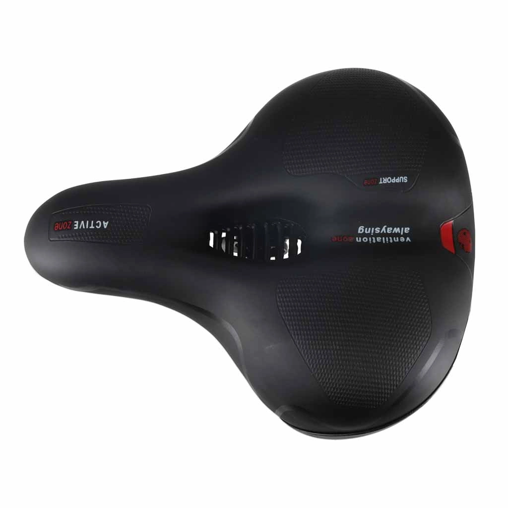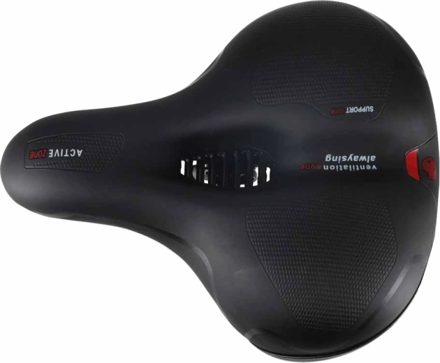 Det komfortable cykelsæde til by- og trekkingkørsel tilbyder en bred ergonomisk form, elastisk skumpolstring og dobbelt fjedringsdæmpning for en jævn tur uden trykpunkter. Takket være den centrale ventilationskanal forbliver sædet luftigt, den vandtætte overflade af PU-læder modstår regn, og den integrerede bageste refleks øger synligheden efter mørkets frembrud.