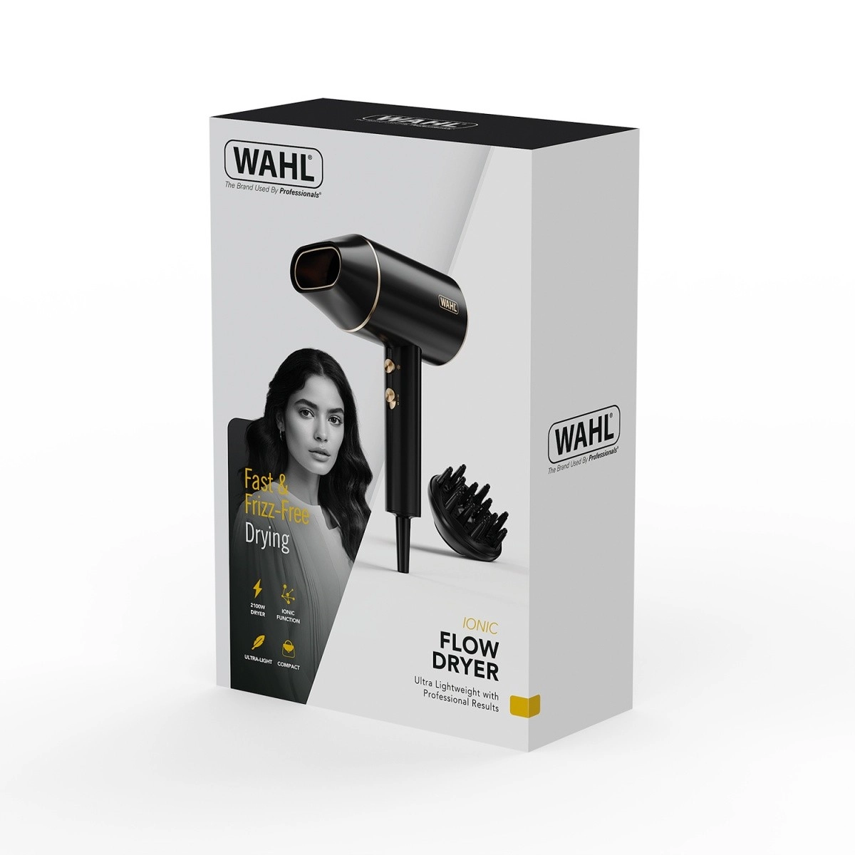 WAHL Ionic Flow hårtørrer kombinerer en kraftig, jævn luftstrøm med en let konstruktion for komfortabel daglig brug. Ionteknologien mindsker statisk elektricitet og krus, forkorter tørretiden og efterlader håret glat og skinnende.