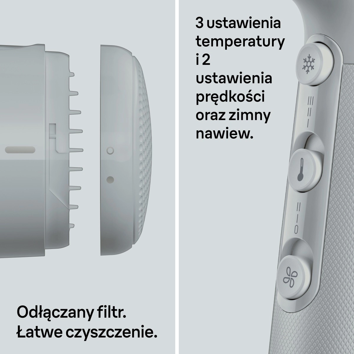 Betjeningen er intuitiv: flere niveauer af varme og hastighed gør det let at tilpasse tørringen til din hårtype. Funktionen kold luft lukker hårstråets skællag og forlænger holdbarheden af din frisure. Det aftagelige bagfilter gør rengøringen nem og forlænger apparatets levetid.