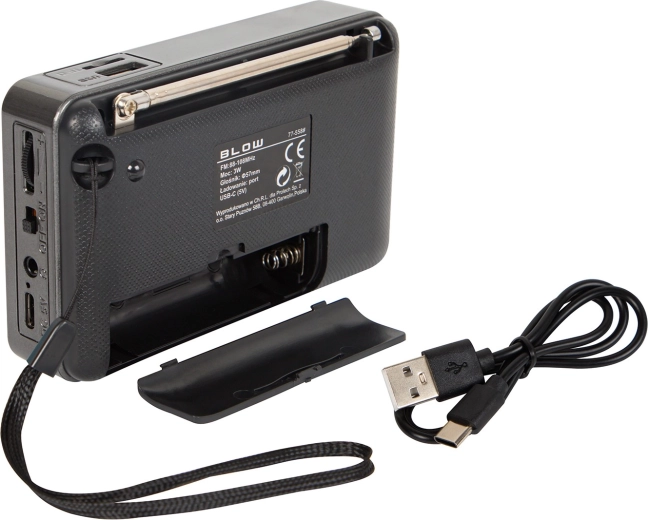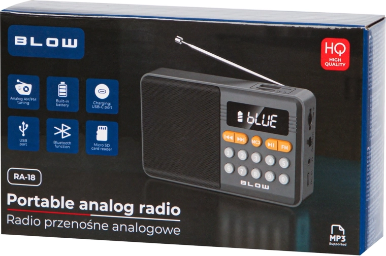 Det kompakte og alsidige radioapparat BLOW RA18 kombinerer FM-modtagelse, Bluetooth-højttaler og afspilning af MP3 fra USB og microSD. Takket være den teleskopiske antenne leverer den klar modtagelse, og det indbyggede 800 mAh batteri sikrer timer af drift. Praktisk opladning via USB‑C og det bærbare design gør den til en ideel ledsager på farten, i værkstedet og derhjemme.