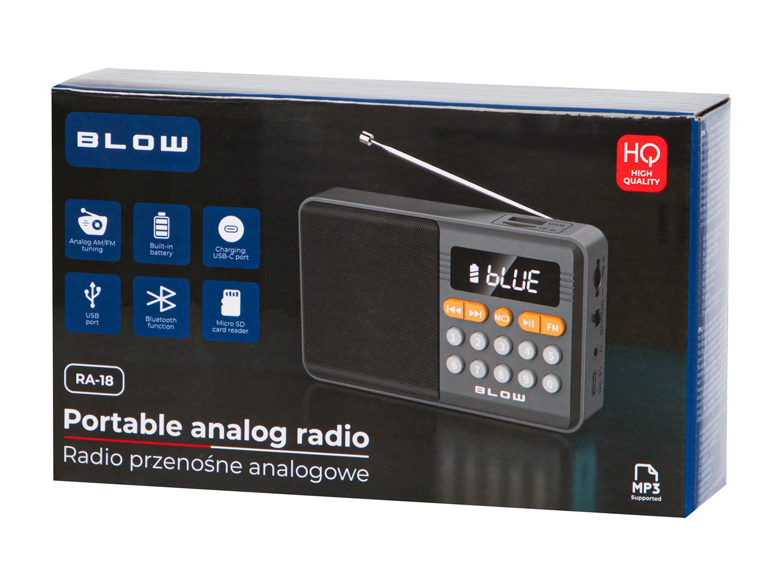 BLOW RA18 er en praktisk bærbar radio, der kombinerer analog AM/FM-modtagelse med moderne tilslutningsmuligheder. Som trådløs Bluetooth-højttaler afspiller den musik fra telefon, laptop eller tablet og understøtter samtidig MP3 fra microSD-kort og USB-flashdrev. Med de kompakte mål, håndledsrem og overskuelig betjening er den ideel på rejser, til kontoret og på byggepladsen.