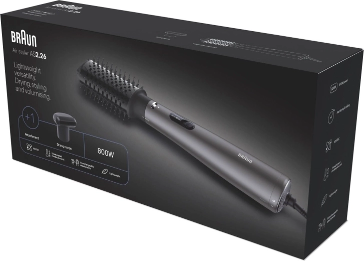 Oplev hverdagsstyling uden besvær. Varmluftsbørsten på 800 W kombinerer tørring og formgivning i ét trin, så du på få minutter kan skabe glatte, elastiske og fyldige frisurer. Takket være ionisering bliver håret mere glansfuldt, mindre statisk og holder formen bedre.