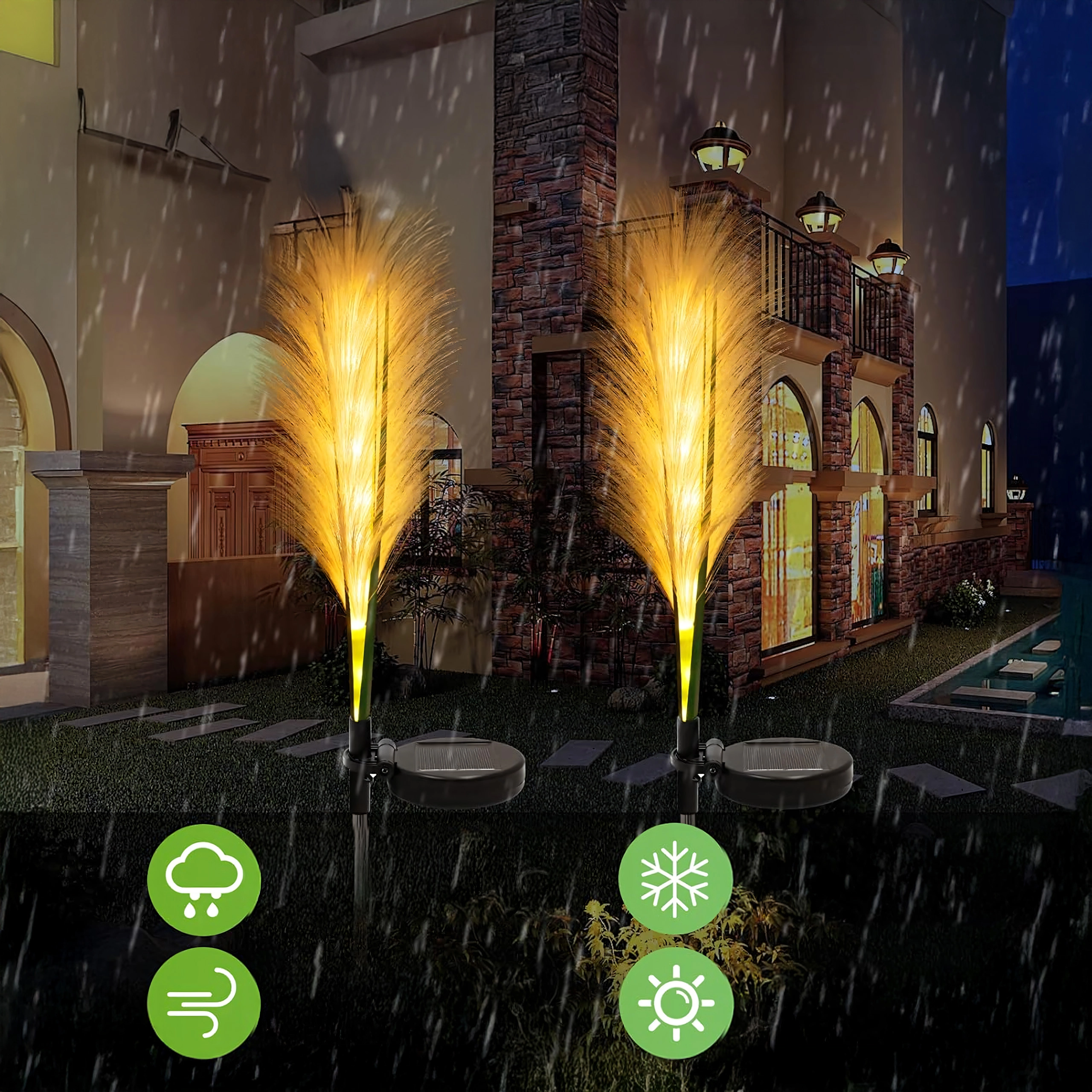 Sæt med to solcelle-havearmaturer, der efterligner pampasgræs og oplyser udeområdet med et blødt, varmt skær. Det integrerede solpanel oplader batteriet i dagtimerne, og lysene tænder automatisk om natten. Takket være den robuste udførelse og fleksible fibre skaber de en glitrende effekt og fremstår naturlige blandt planterne.